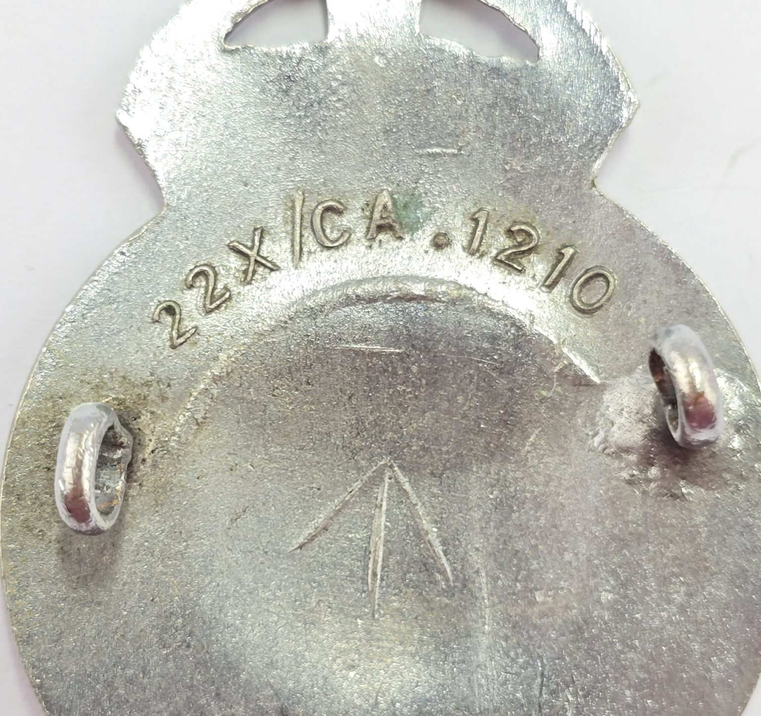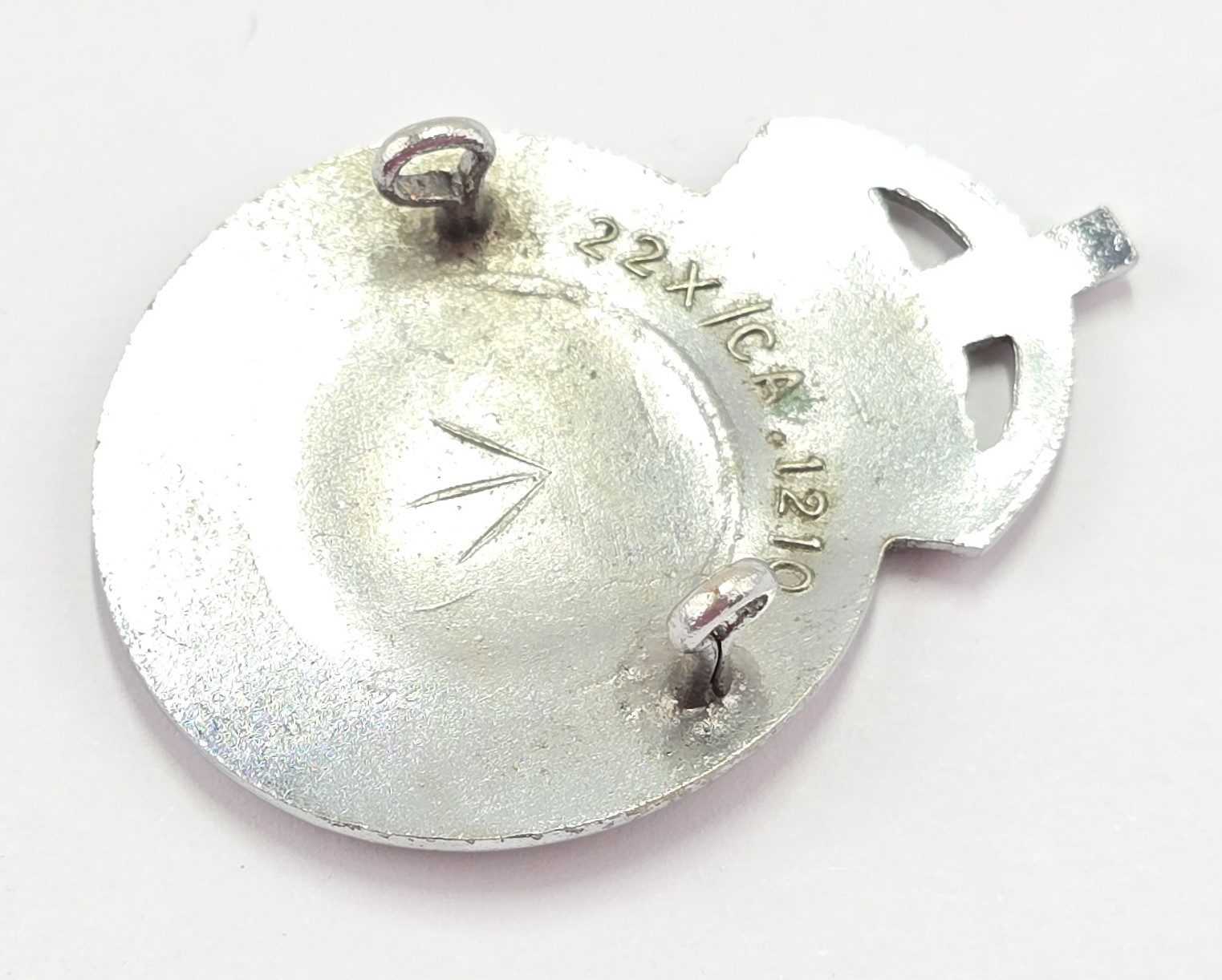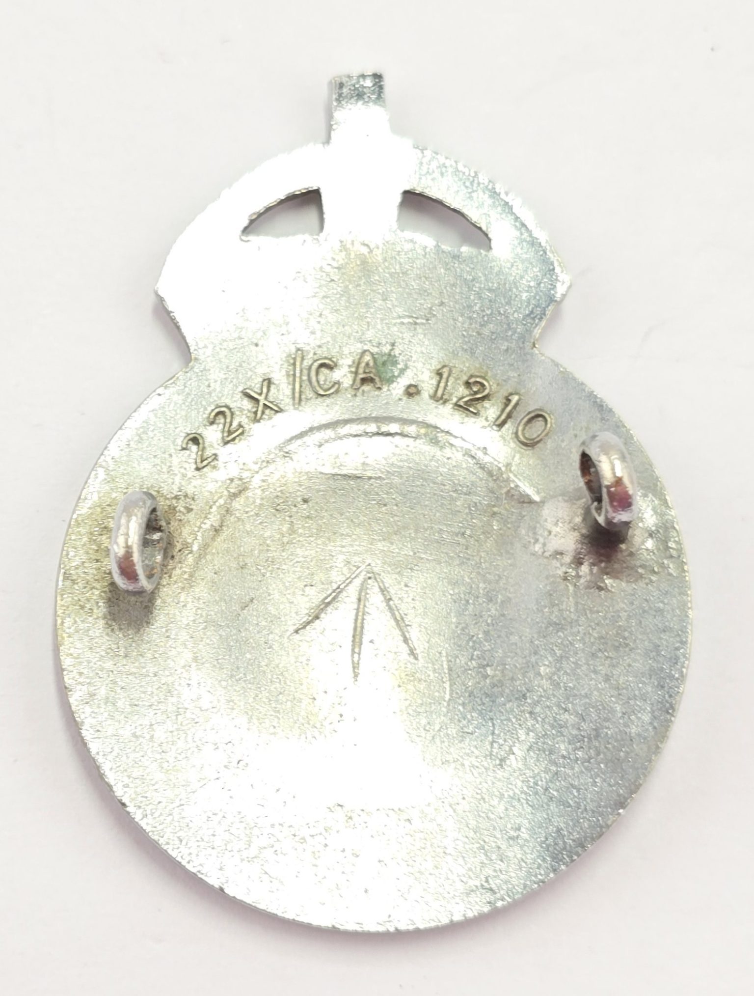 Kings crown white metal cap badge with two lugs to back , with military markings in good condition.