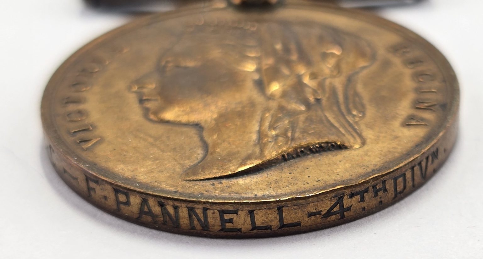Large size medal with original ribbon stamped to rim P.C.-F.PANNELL-4 DIV. in good condition.