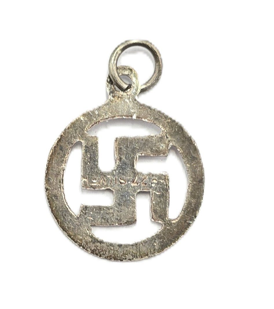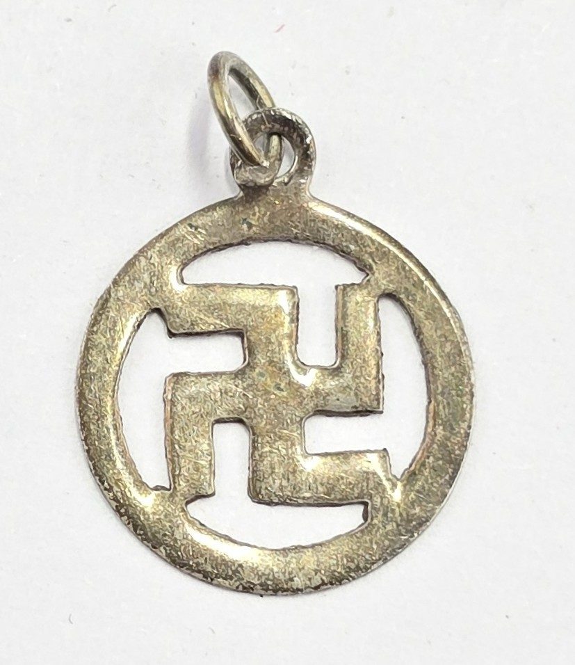Period swastika pendant stamped SILVER. 14 mm wide, maybe a good luck pendant in used condition.