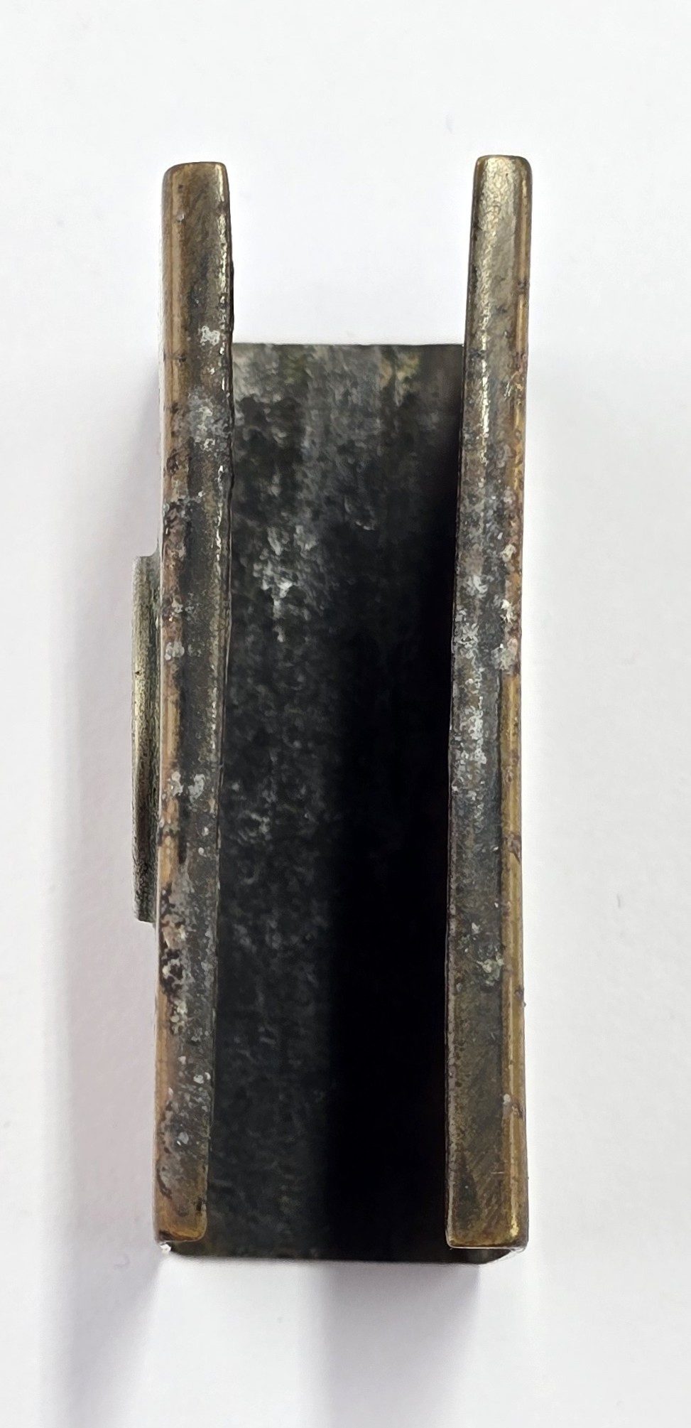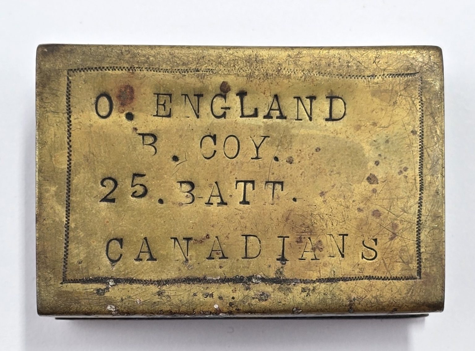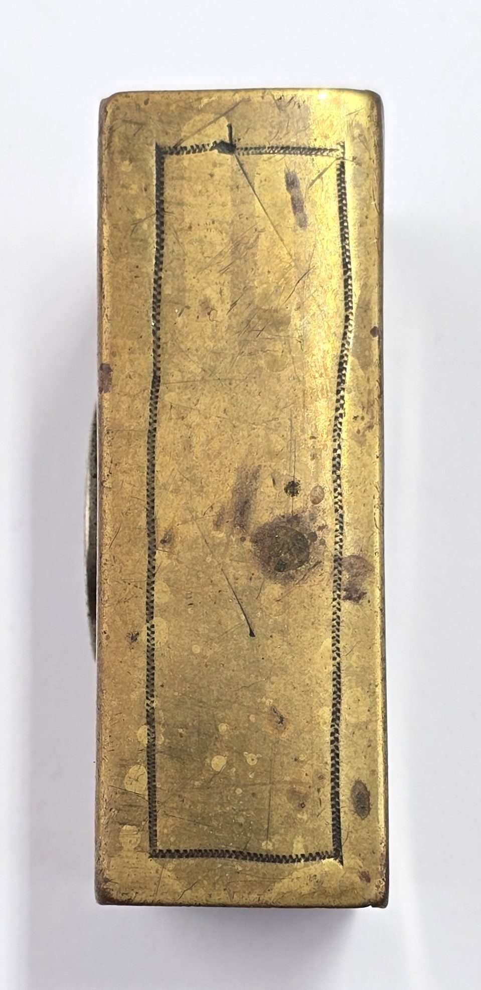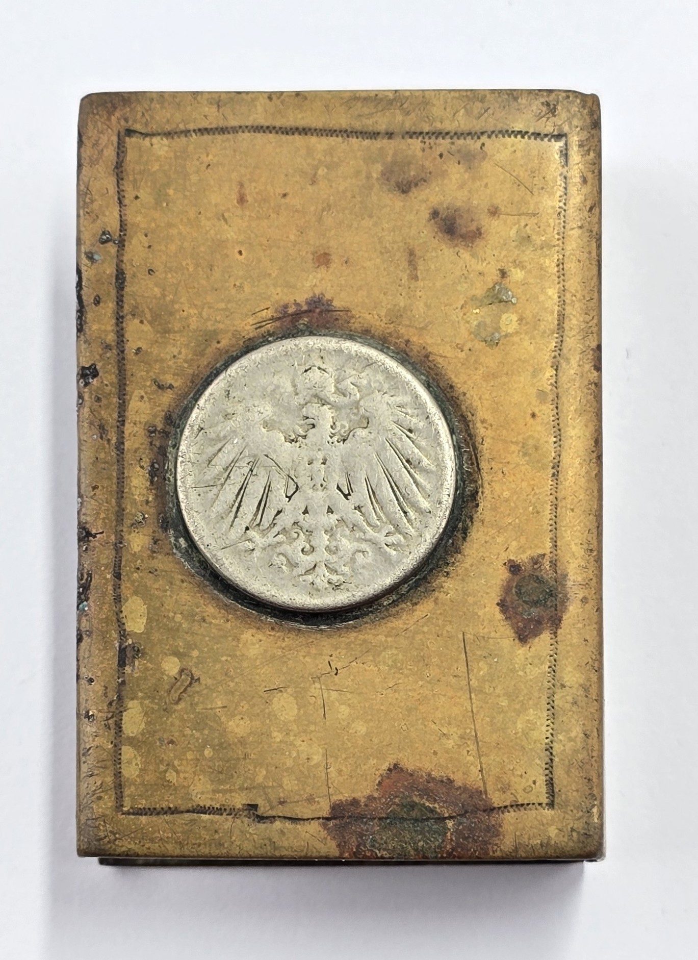 Brass cover with silver coin one side and owners details to other in used condition.