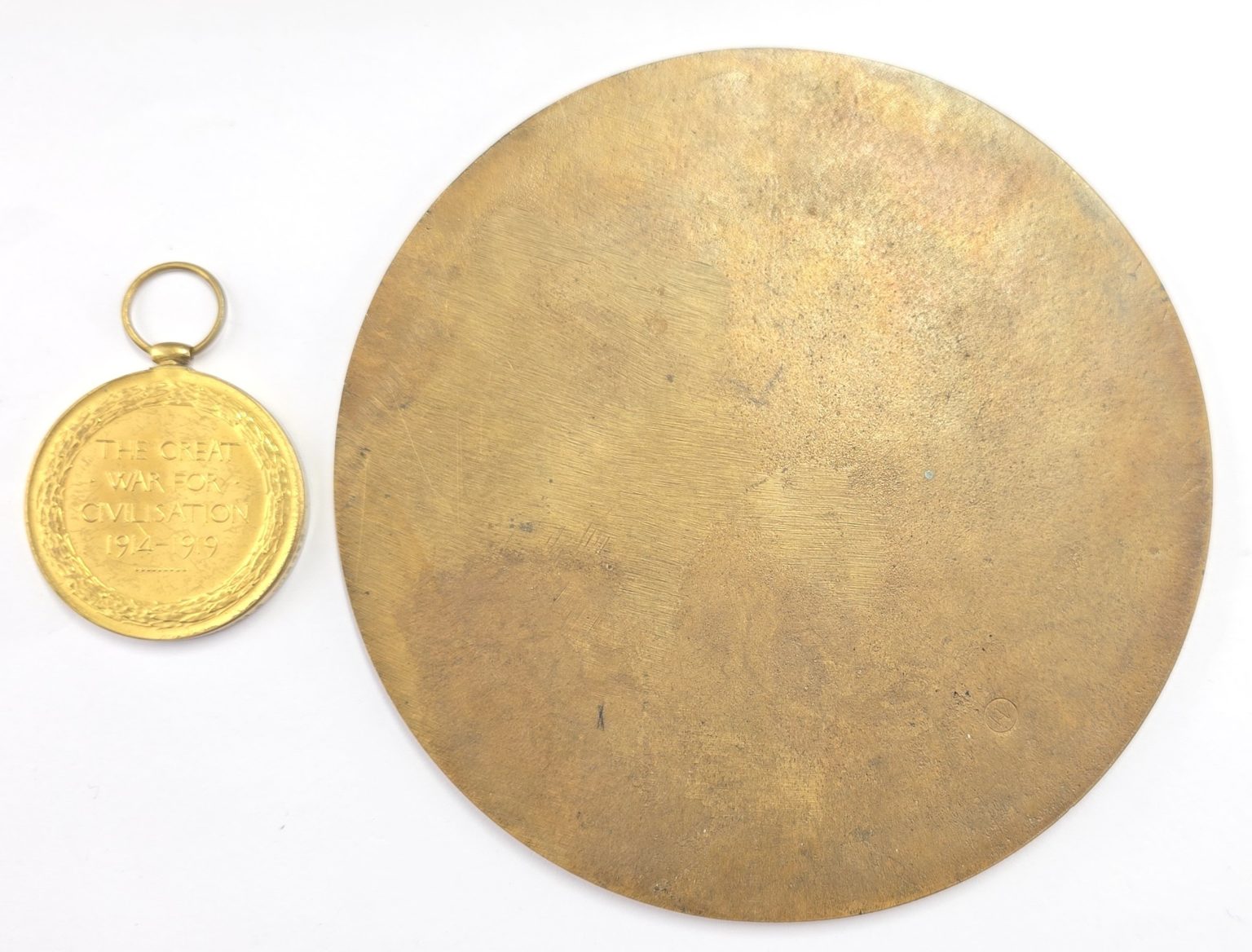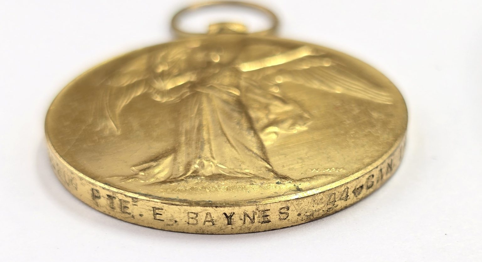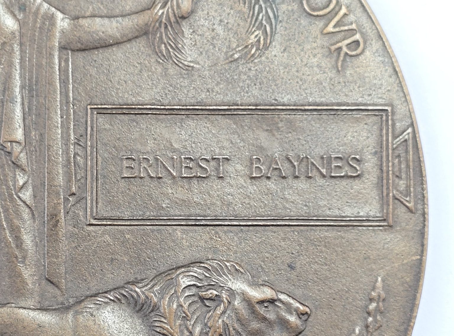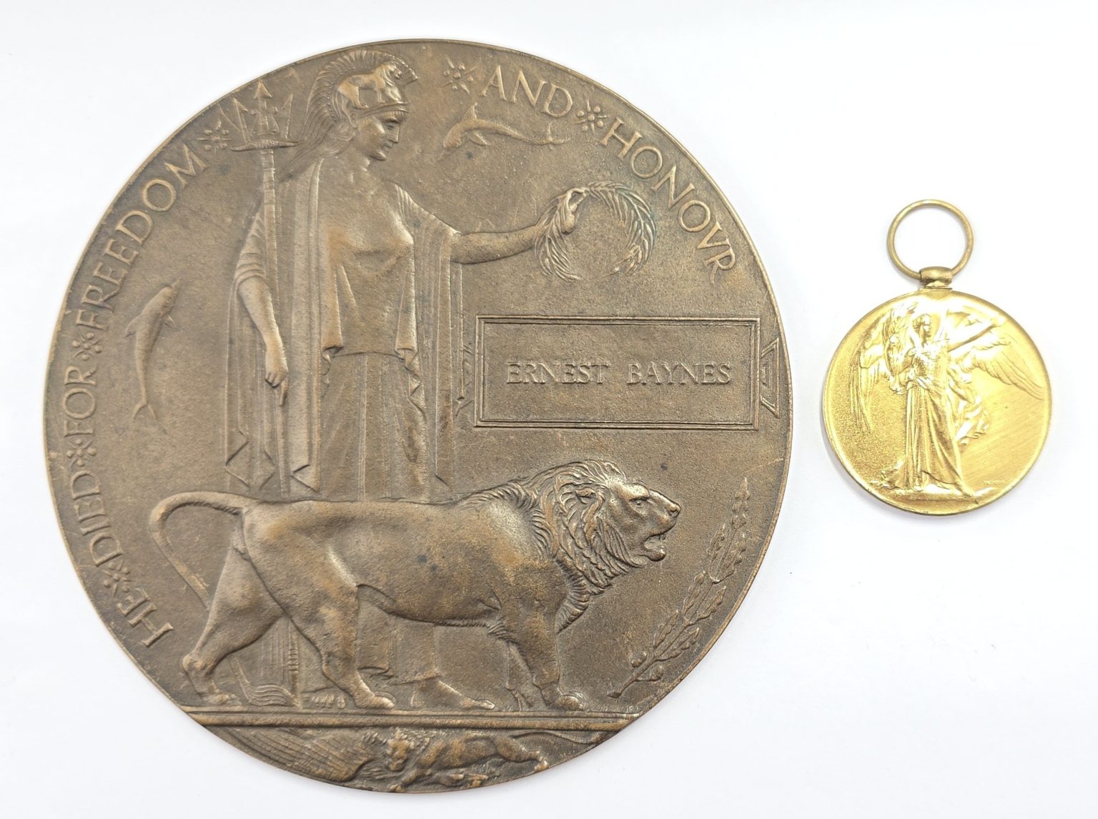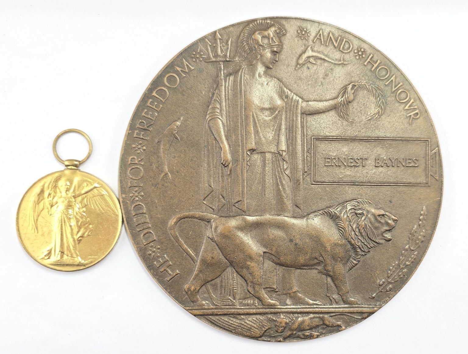 WW1 bronze plaque in the name of ERNEST BAYNES and Victory medal stamped 235204 PTE.E.BAYNES.44-CAN-INF in good used condition.