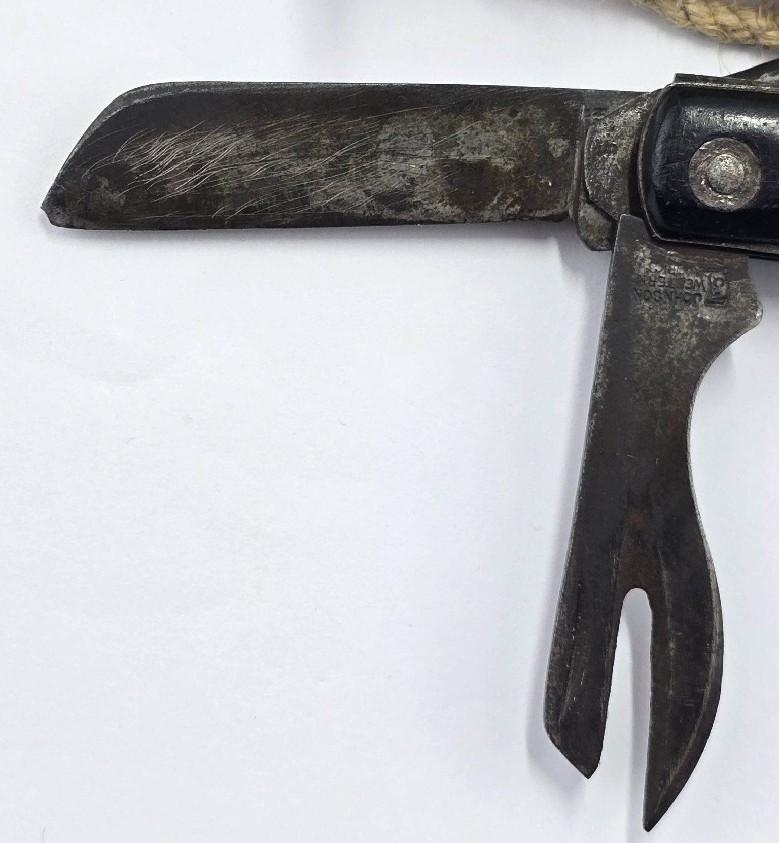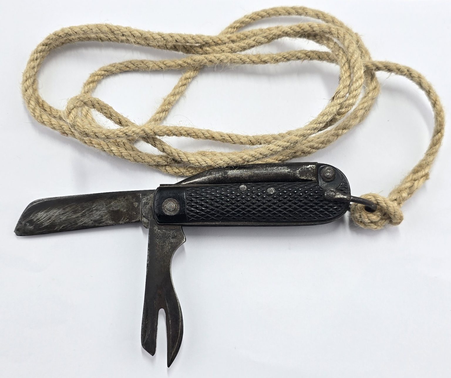 WW2 army jack knife with tight joints,blade stamped with maker,date and arrow,complete with original lanyard in used condition.Please note you must be over 18 Years old to purchase any Bladed item. ID is needed on the first purchase. Sorry we can no longer send any bladed items over sea.