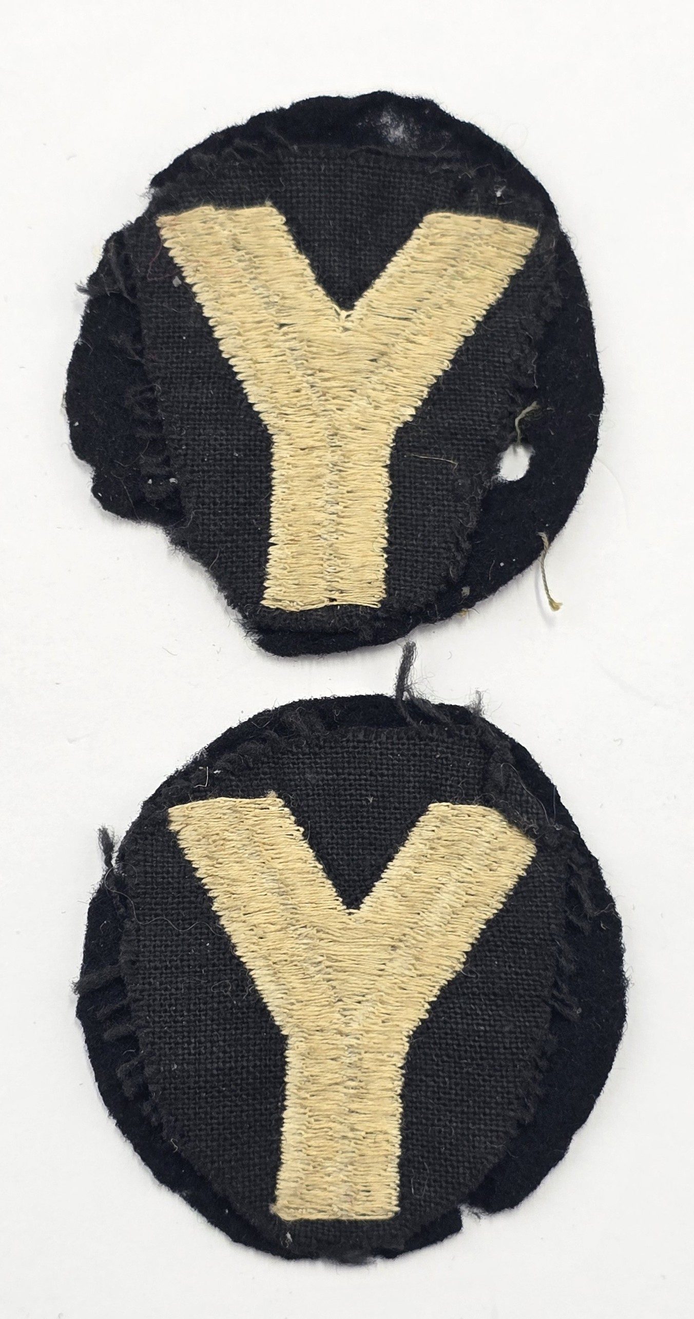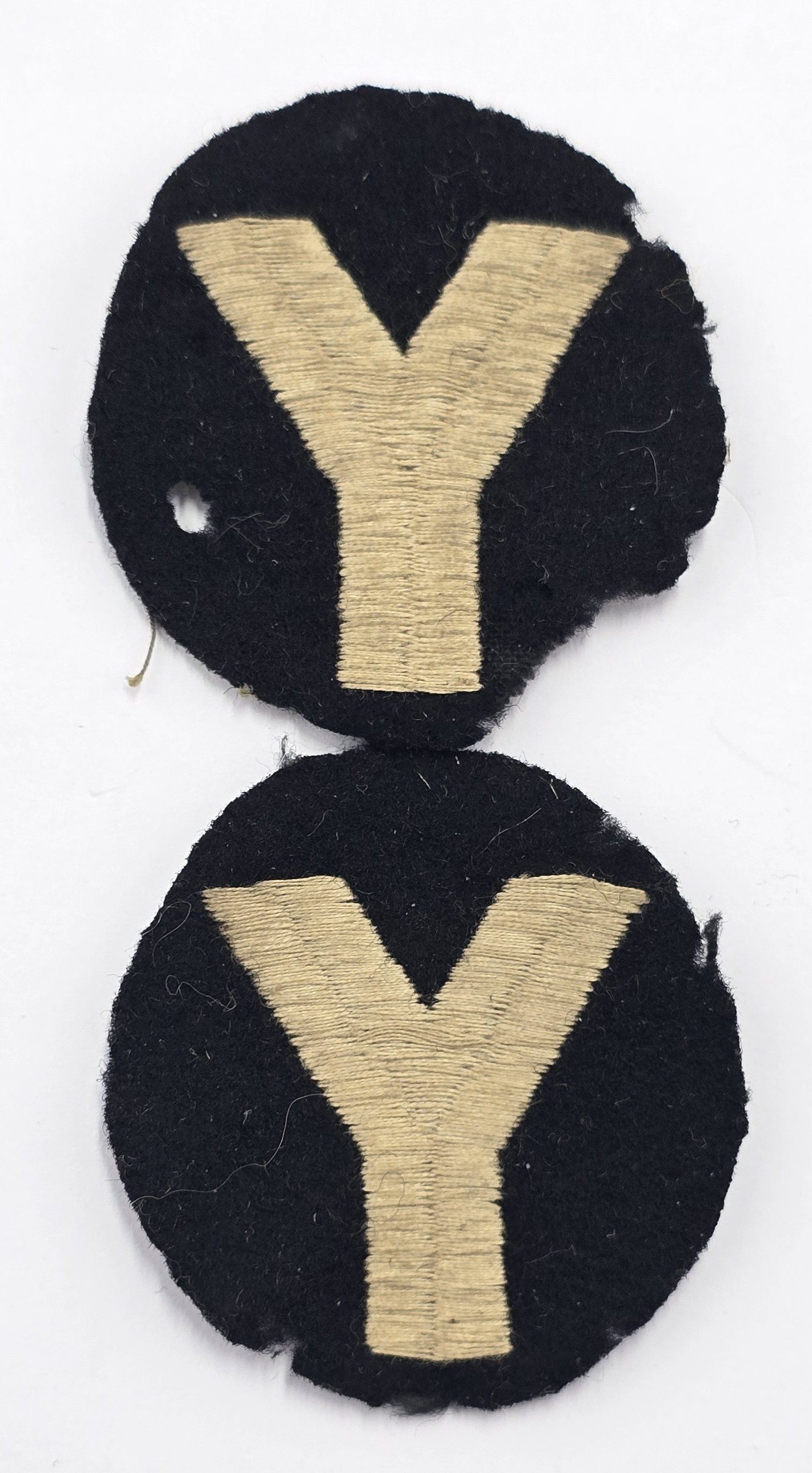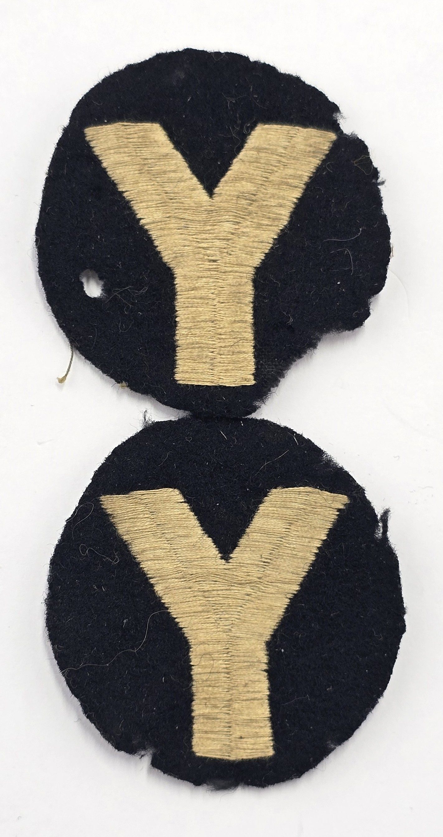 A matched pair of stitched felt badges, one with moth in used condition.