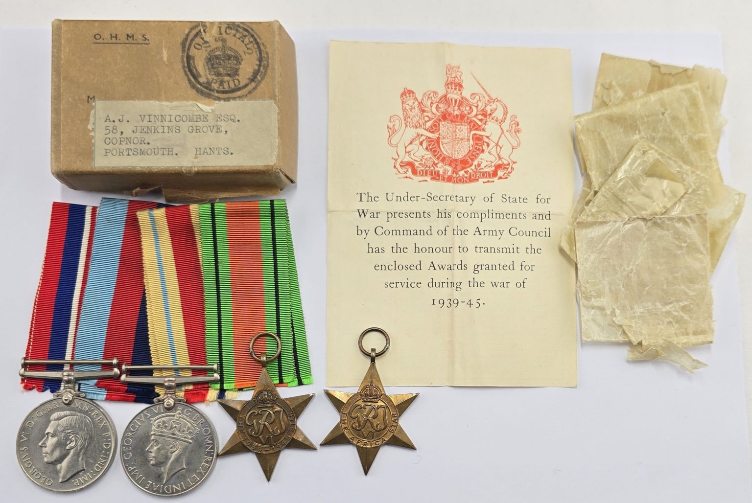 WW2 1939-45 Star, Africa Star,War and Defence medals in box of issue with slip and owners details to front of box in good condition.