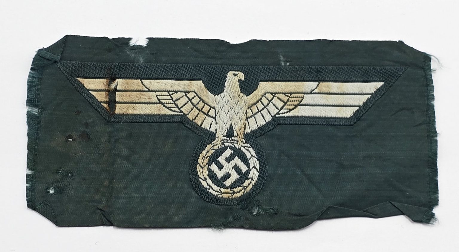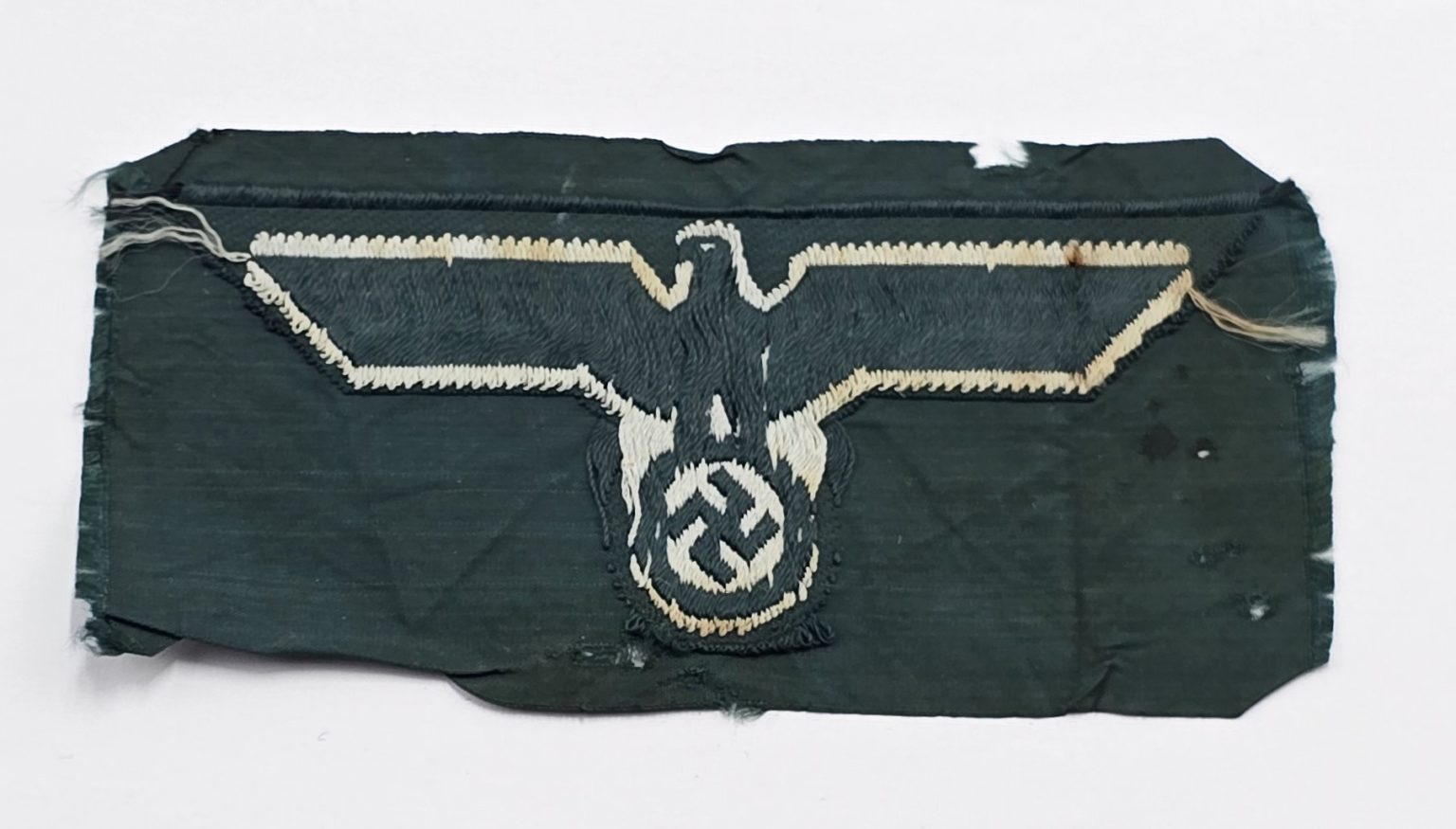Uncut Bevo woven army breast eagle and swastika on green in well used condition.
