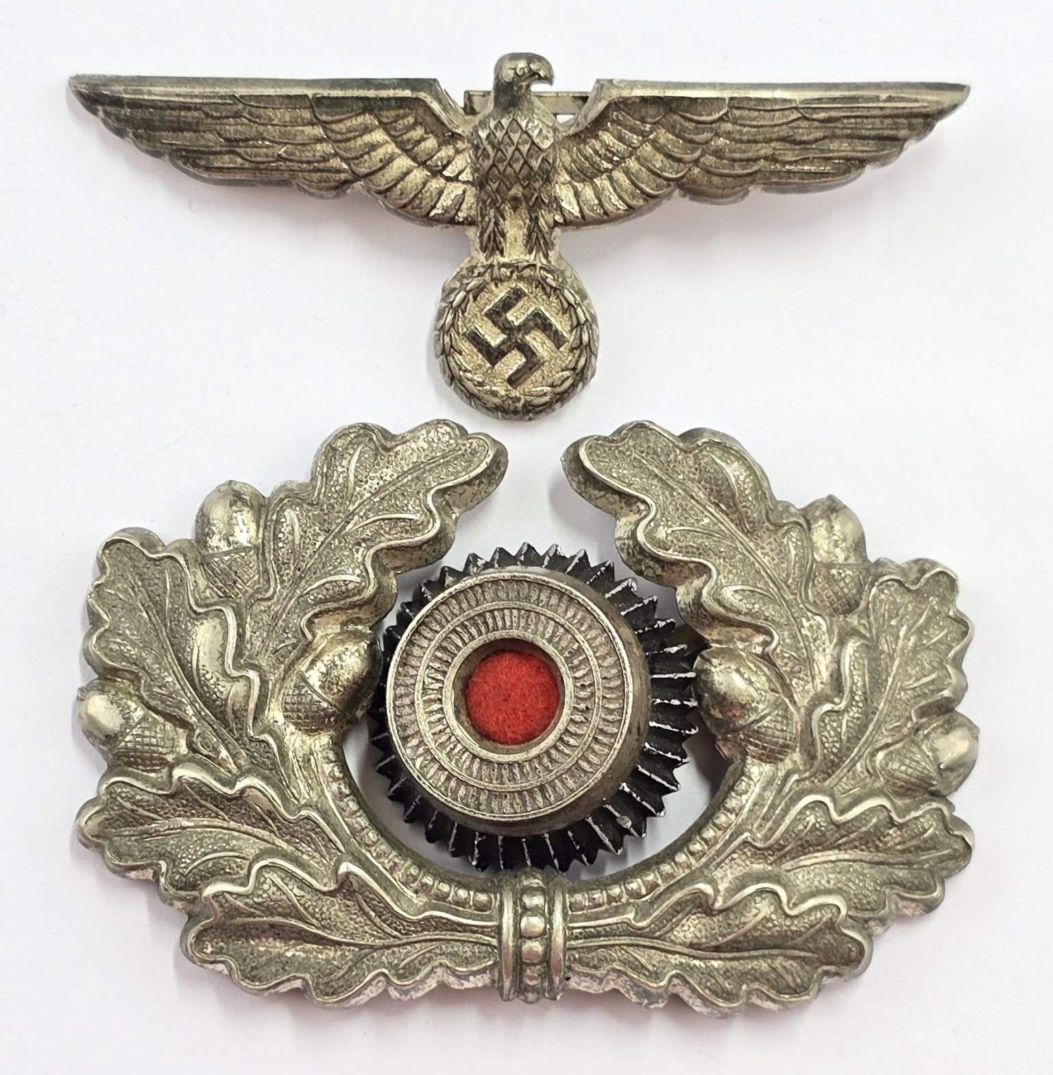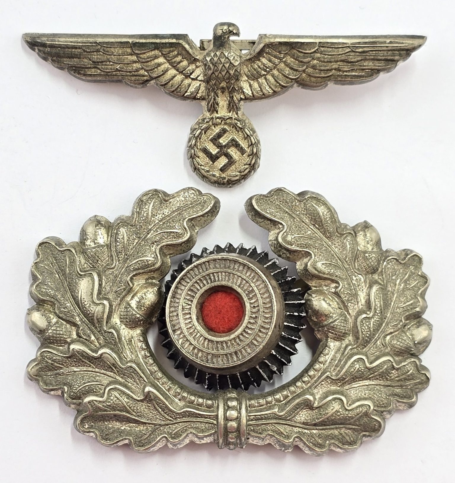 WW2 German army two piece cap wreath and cockade with three pins to back with eagle with prongs to back in used condition.
