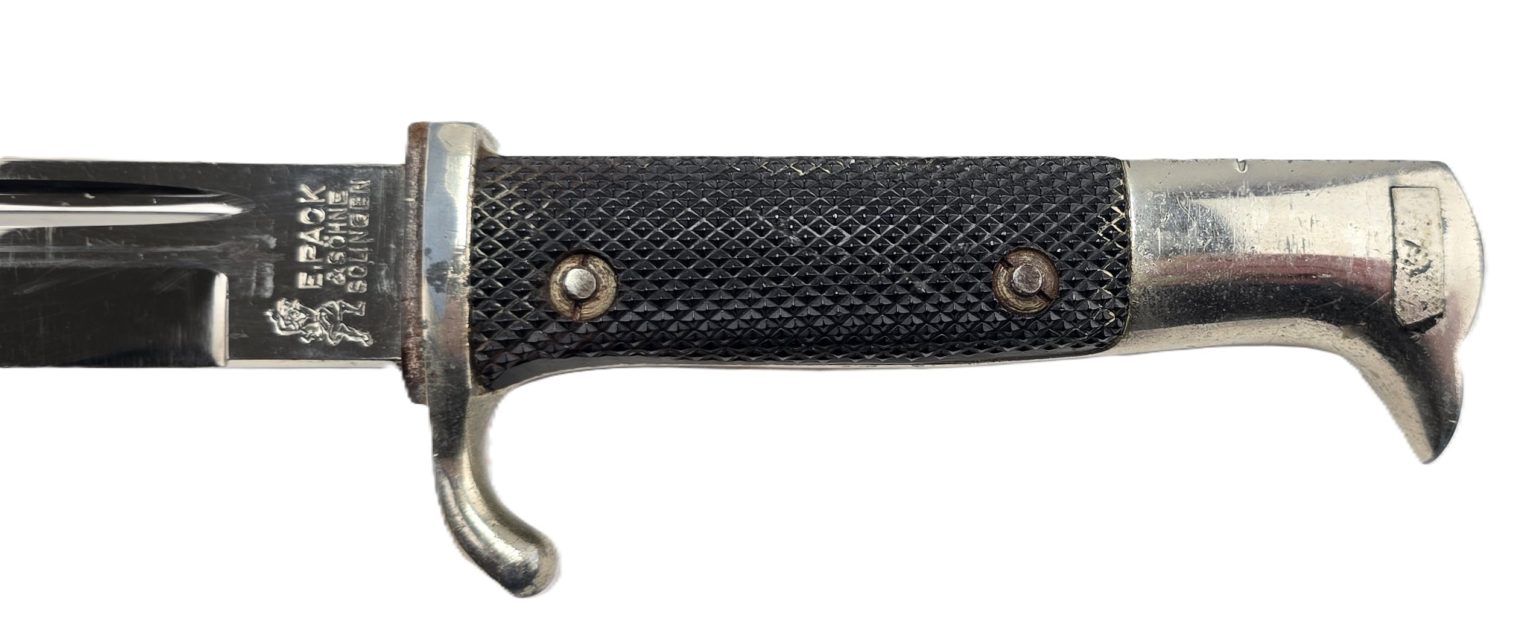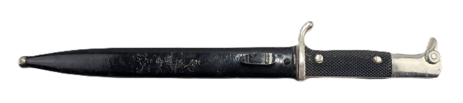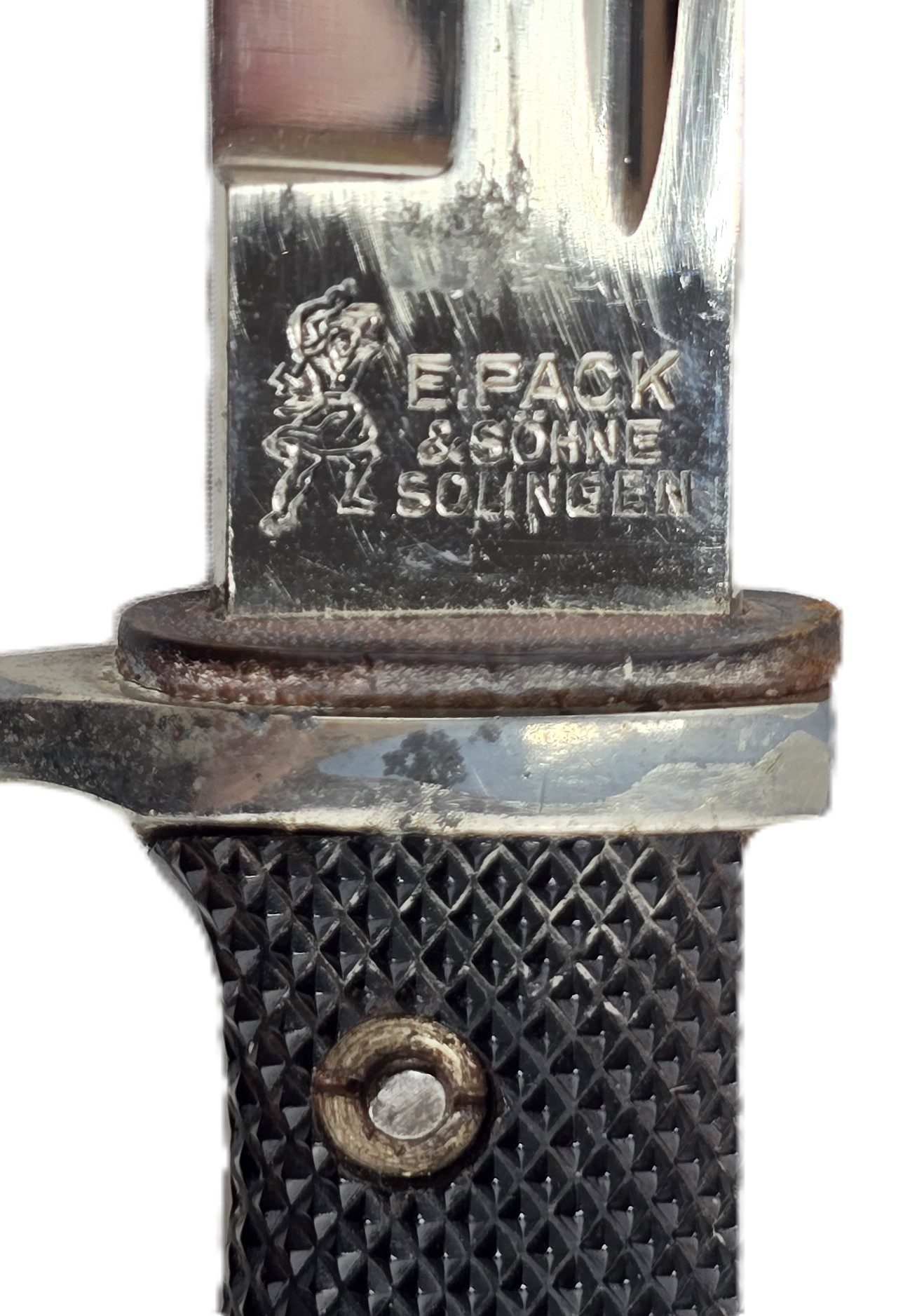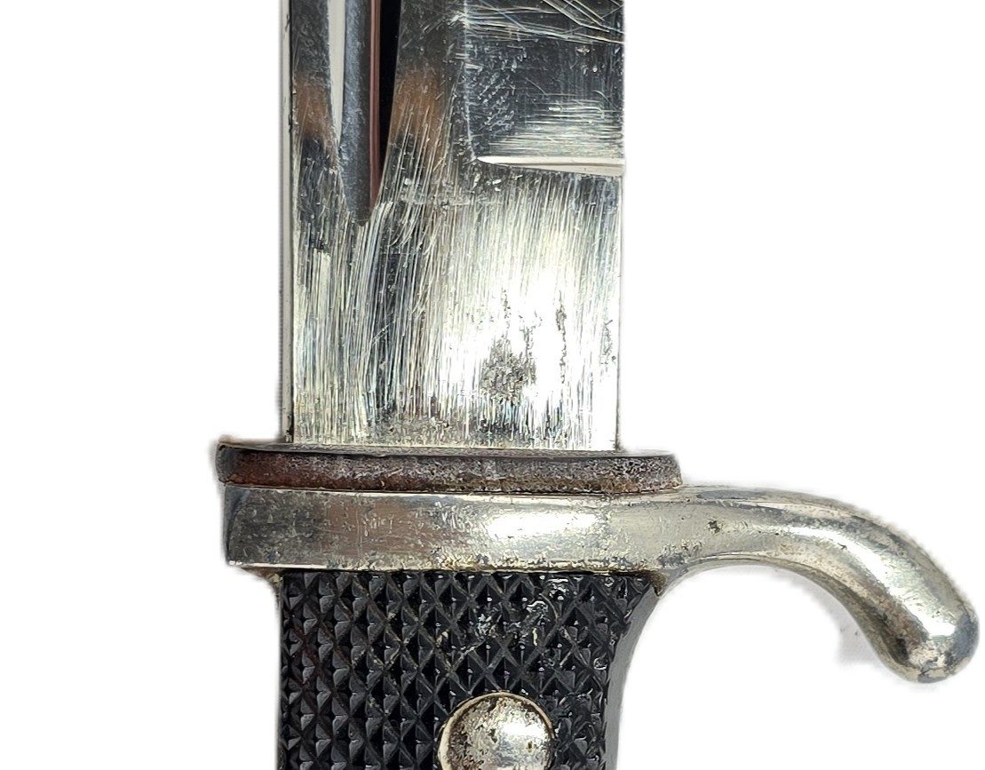 WW2 German short type dress bayonet,maker to blade, complete with scabbard,in all round good used condition. Please note you must be over 18 Years old to purchase any Bladed item. ID is needed on the first purchase. Sorry we can no longer send any bladed items over sea.