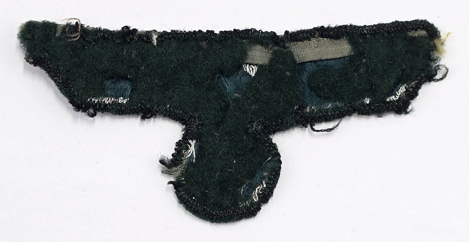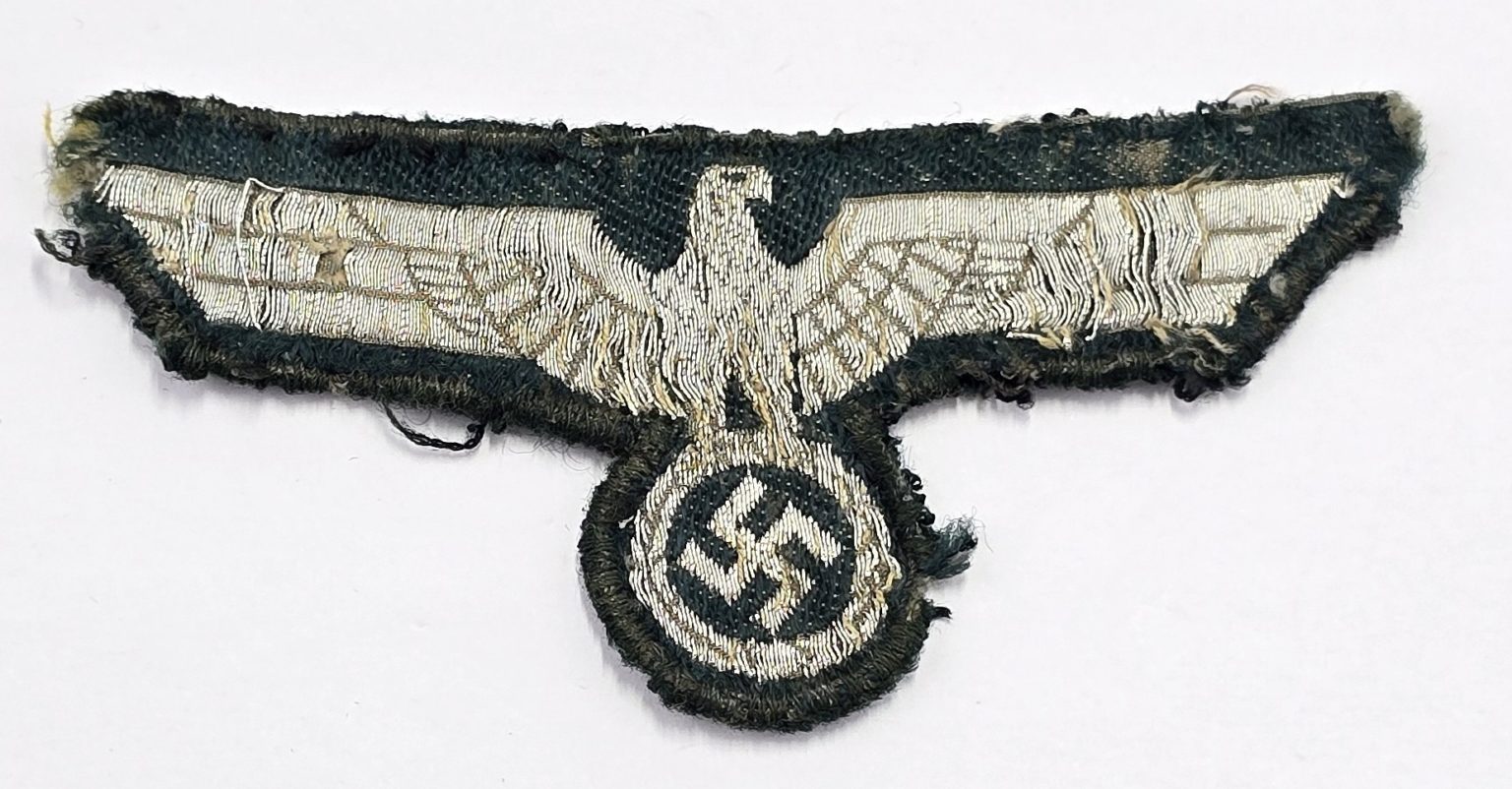WW2 German Bevo woven flat silver wire army breast eagle and swastika in well used condition.
