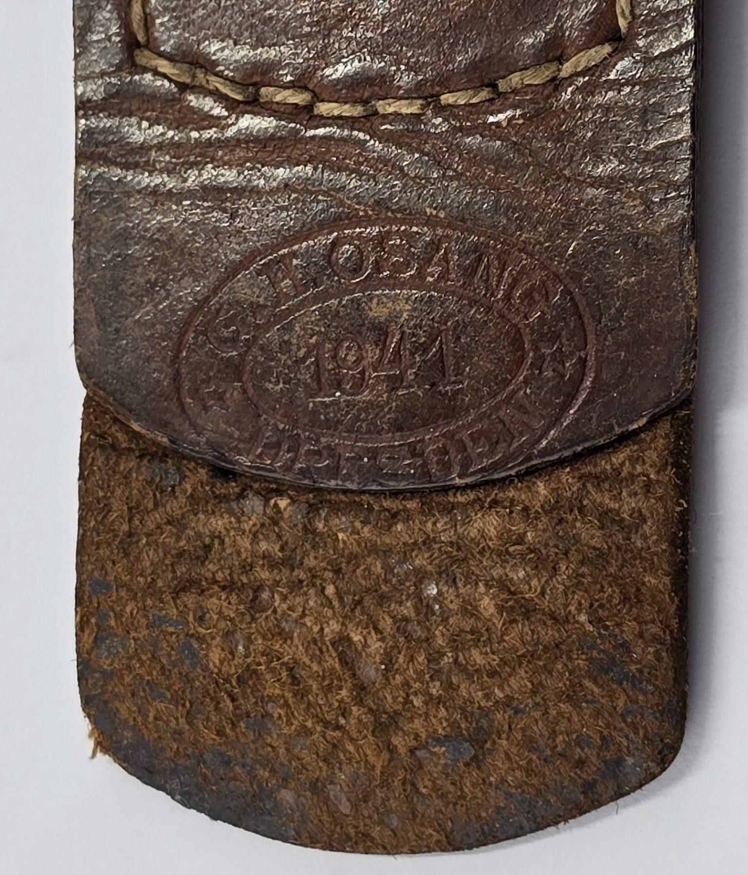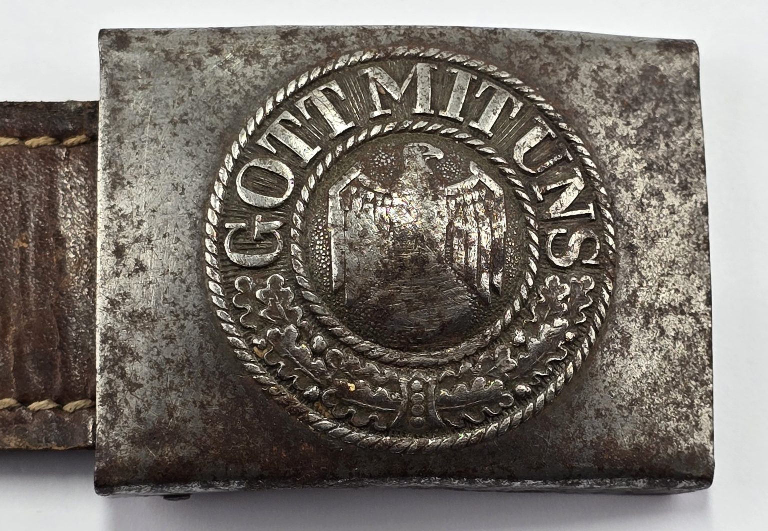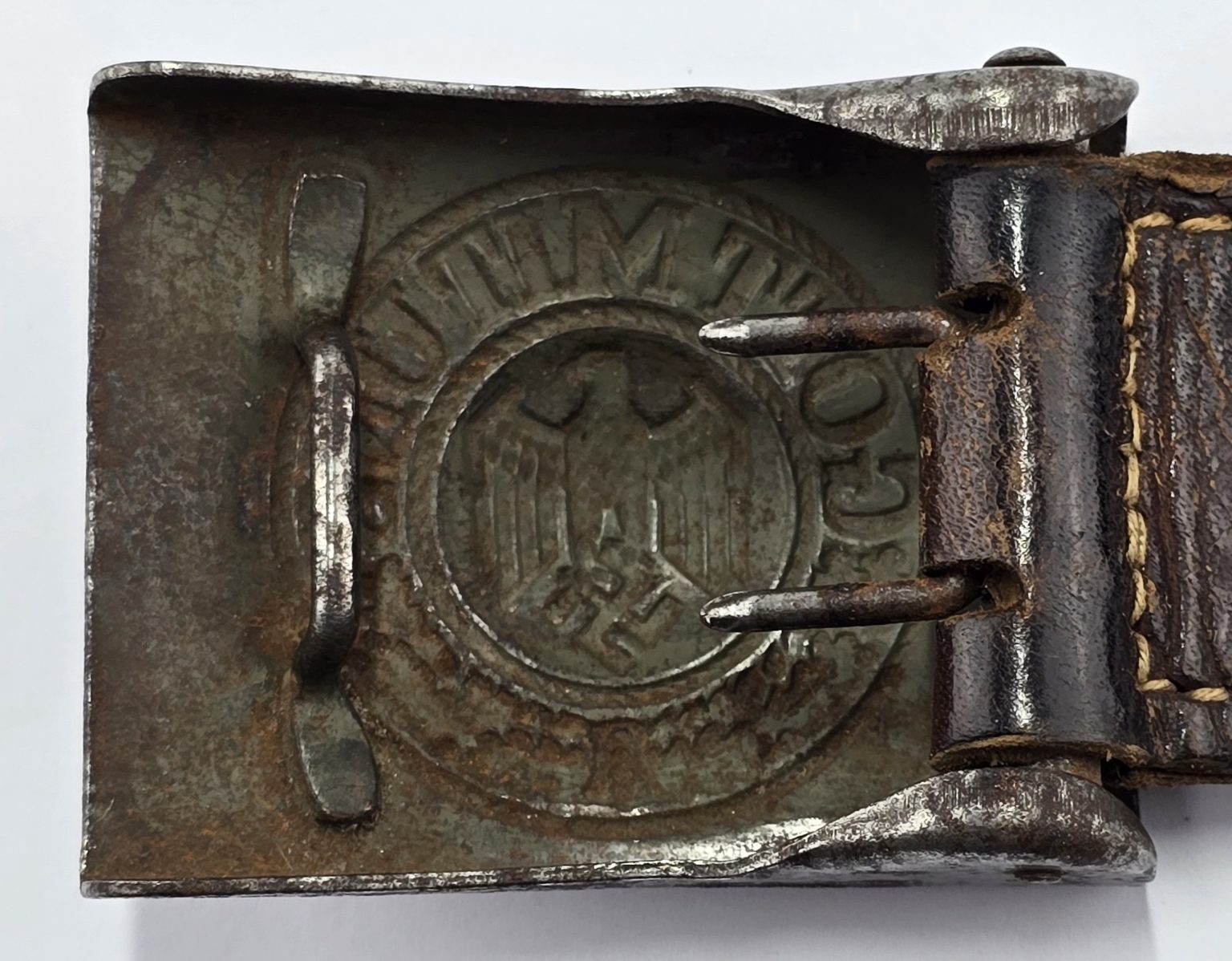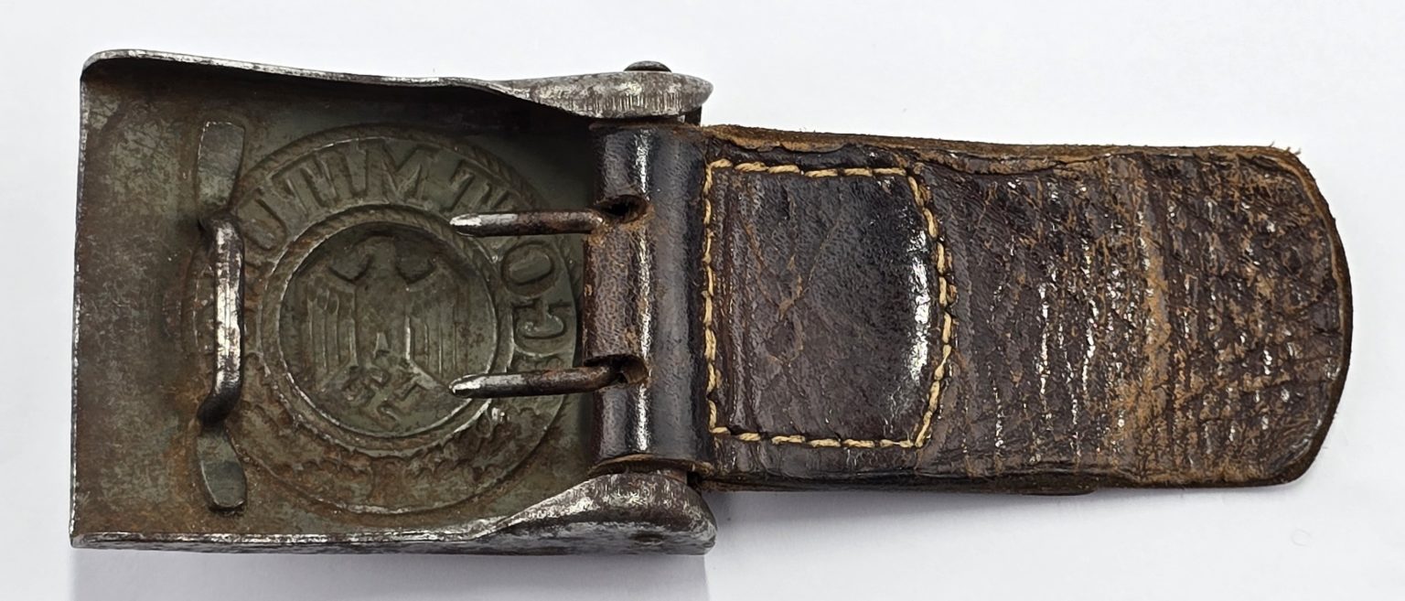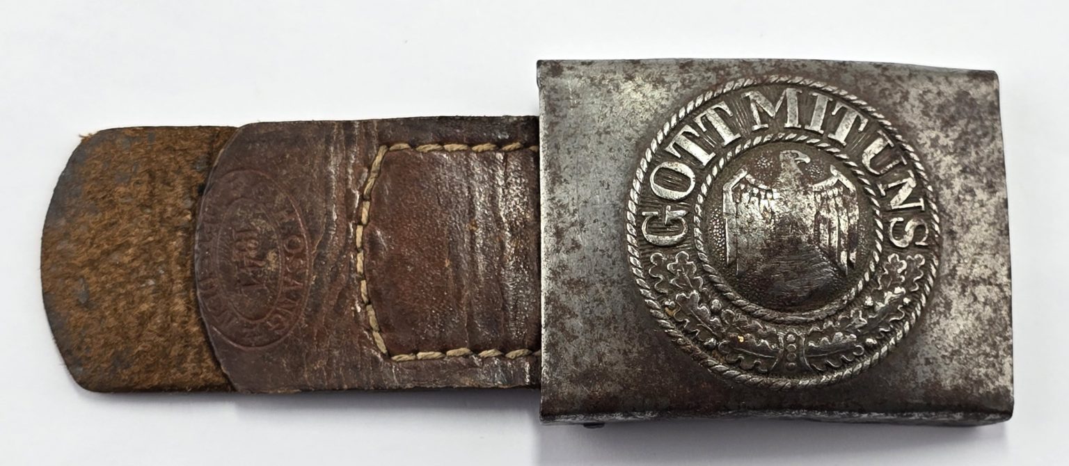 WW2 Combat painted steel combat buckle with fittings to back, eagle with swastika neatly removed to front, complete with leather tab with clear maker stamp in used condition.