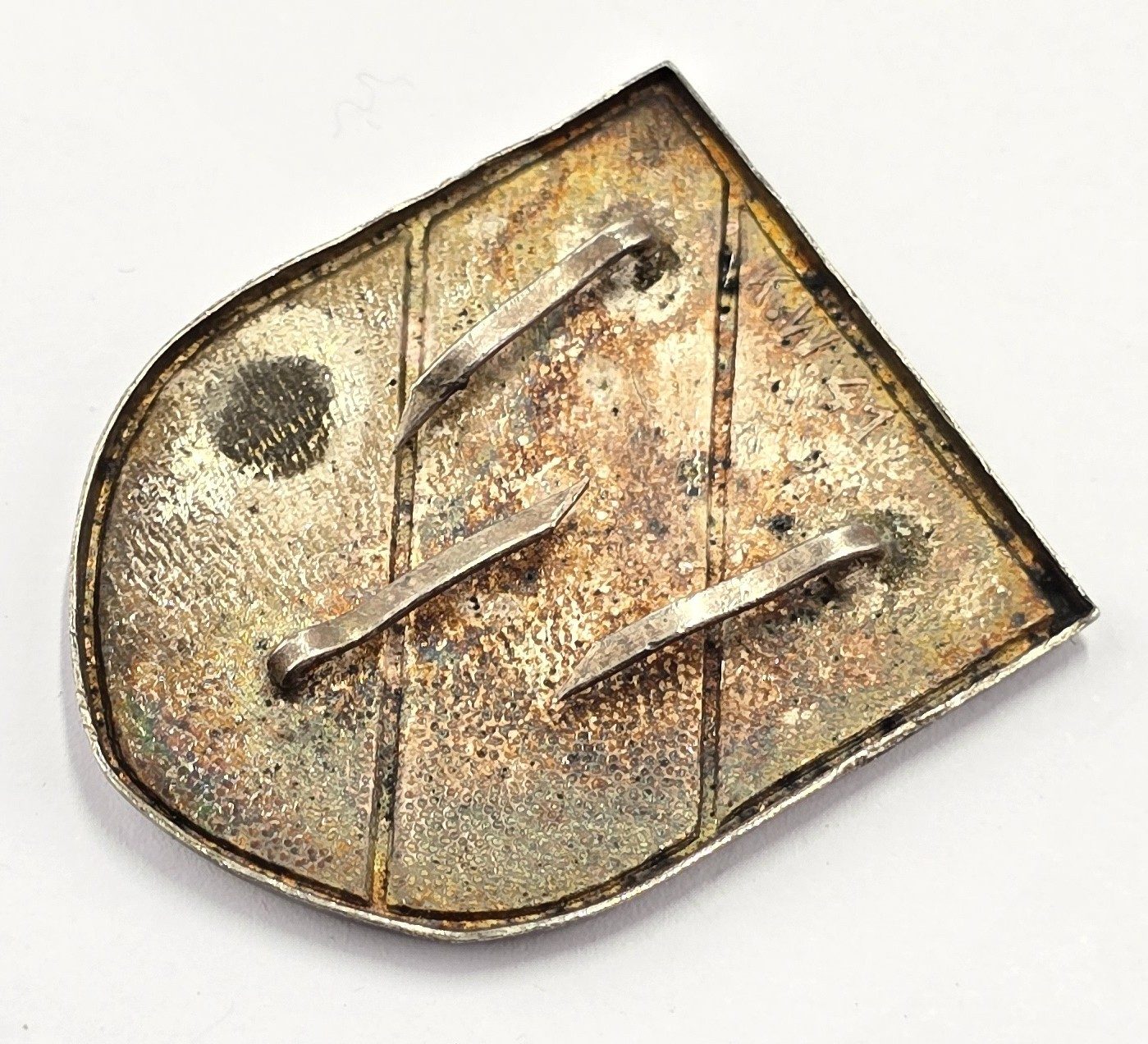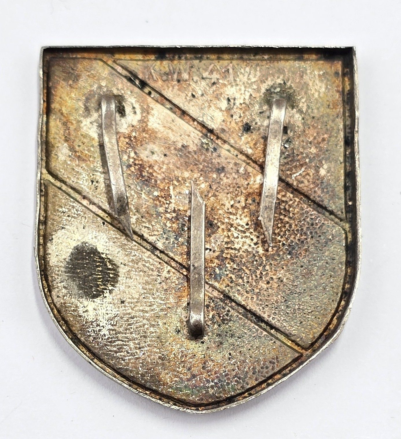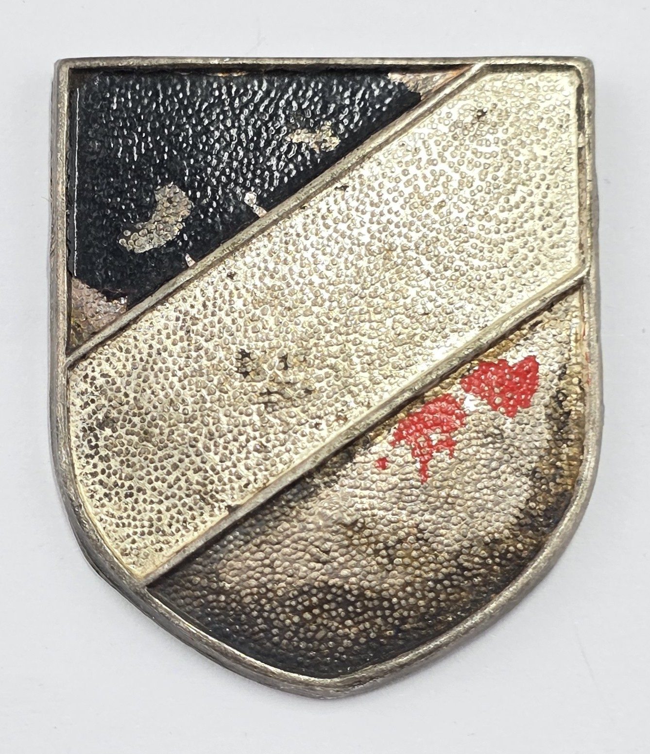 WW2 German stamped metal painted tri-colour decal with three pins and maker to back,in used condition.