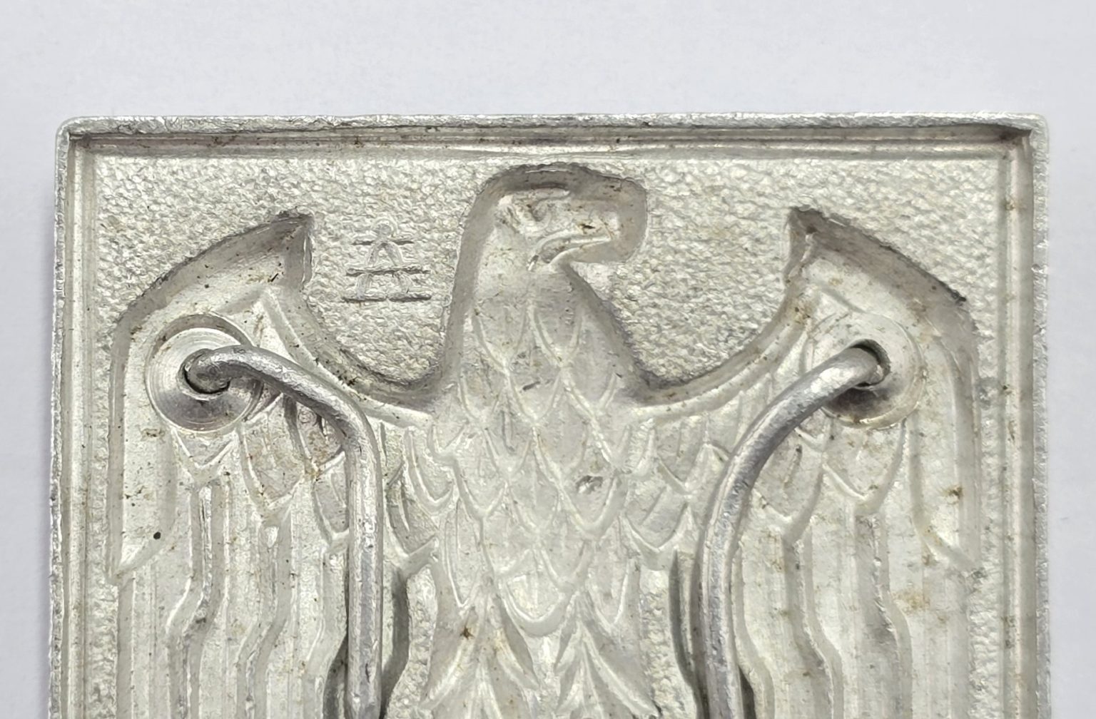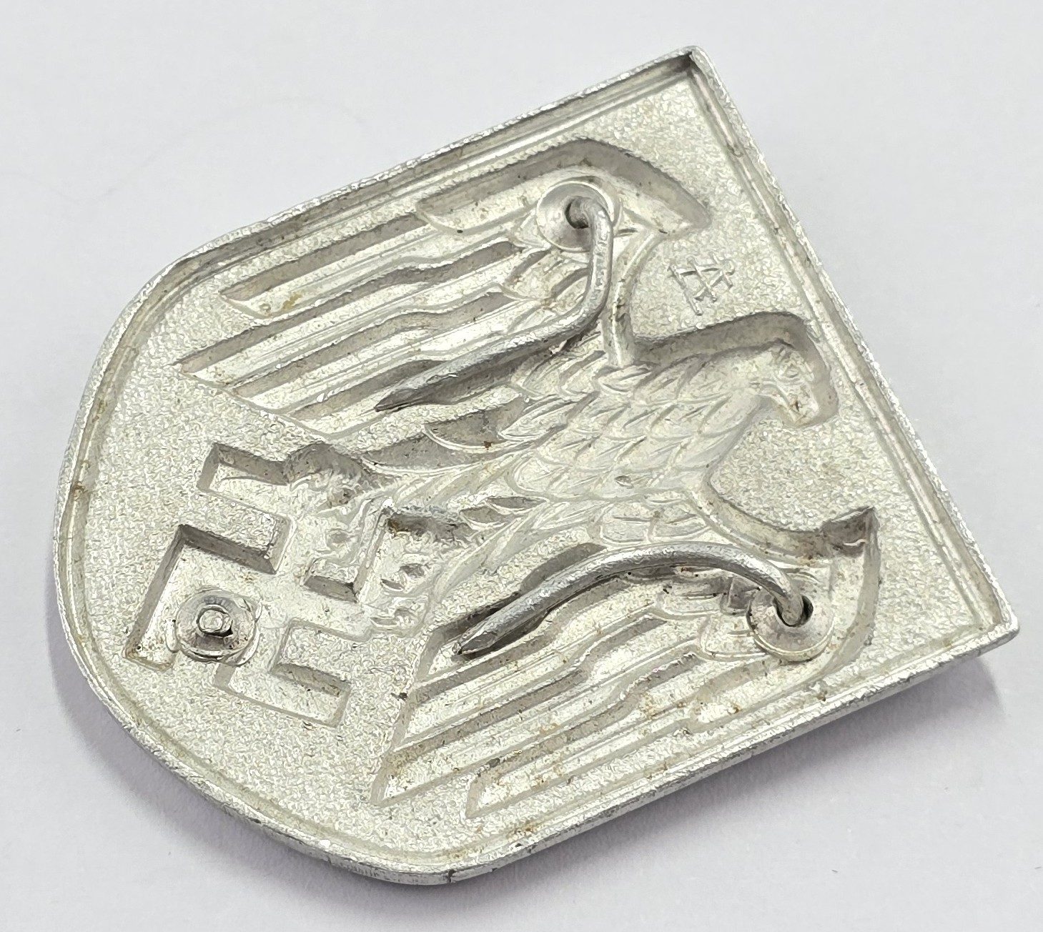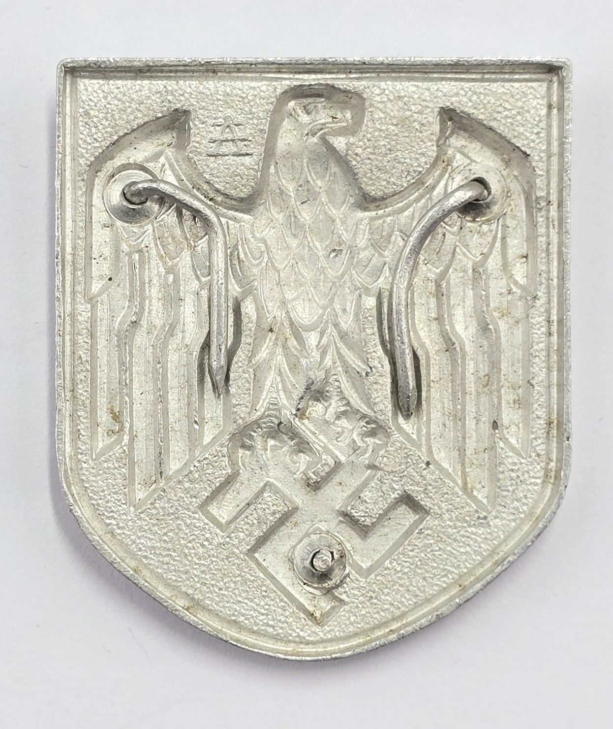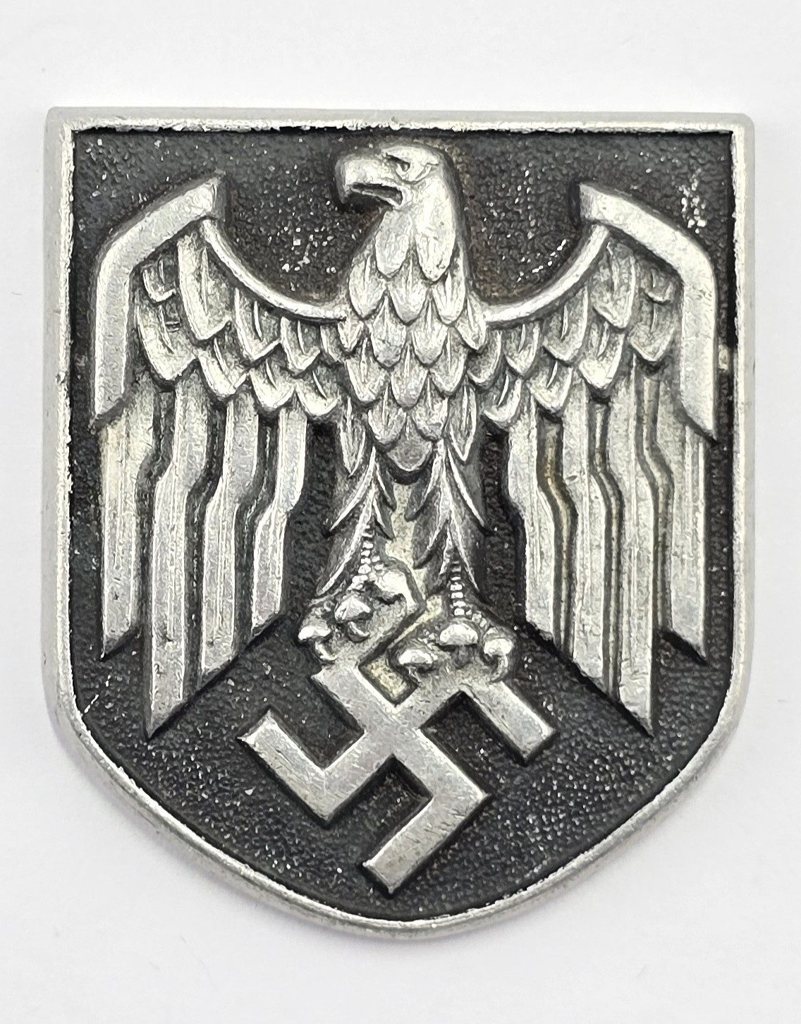 WW2 German stamped metal painted army eagle and swastika decal with two out three pins and maker to back,in used condition.