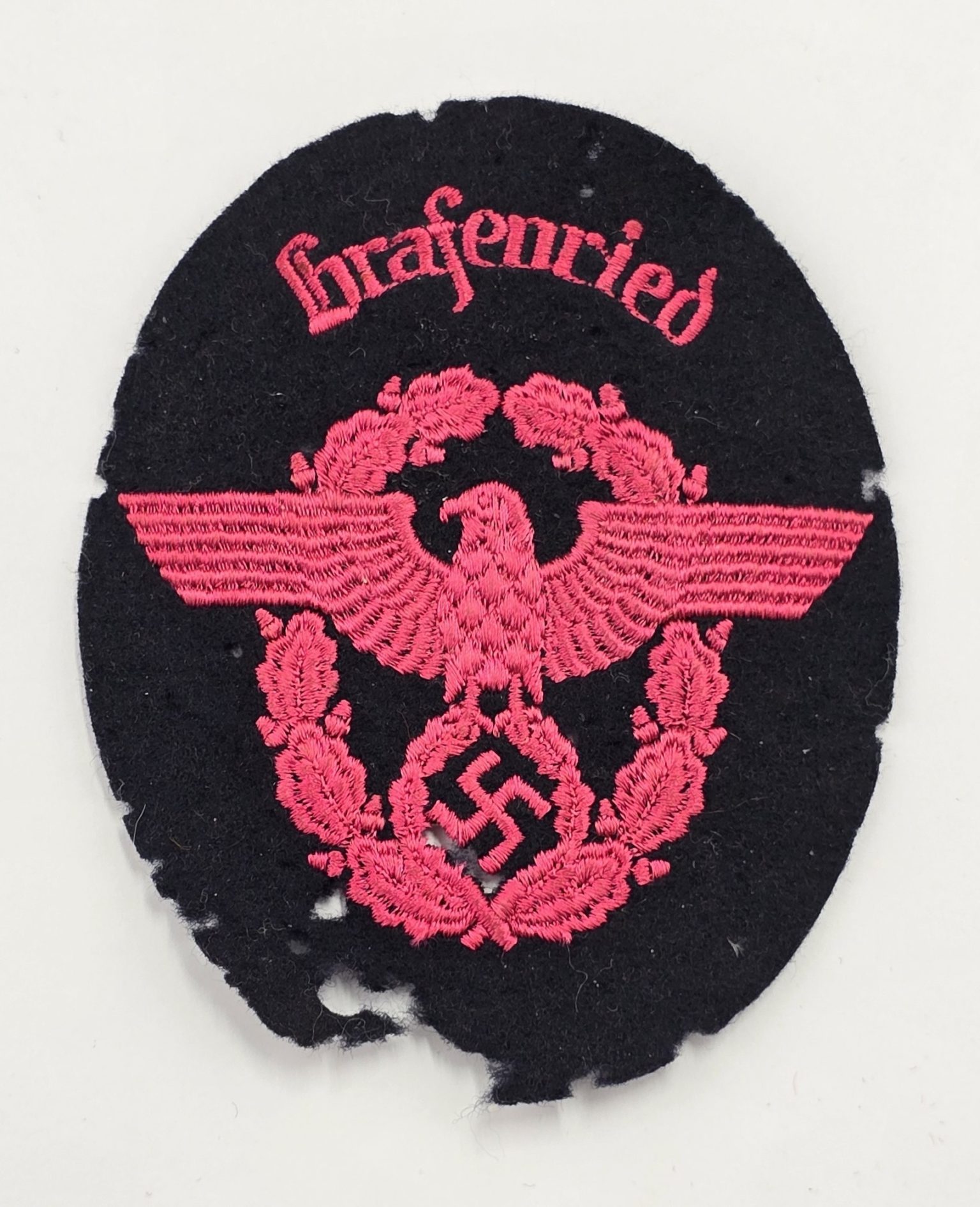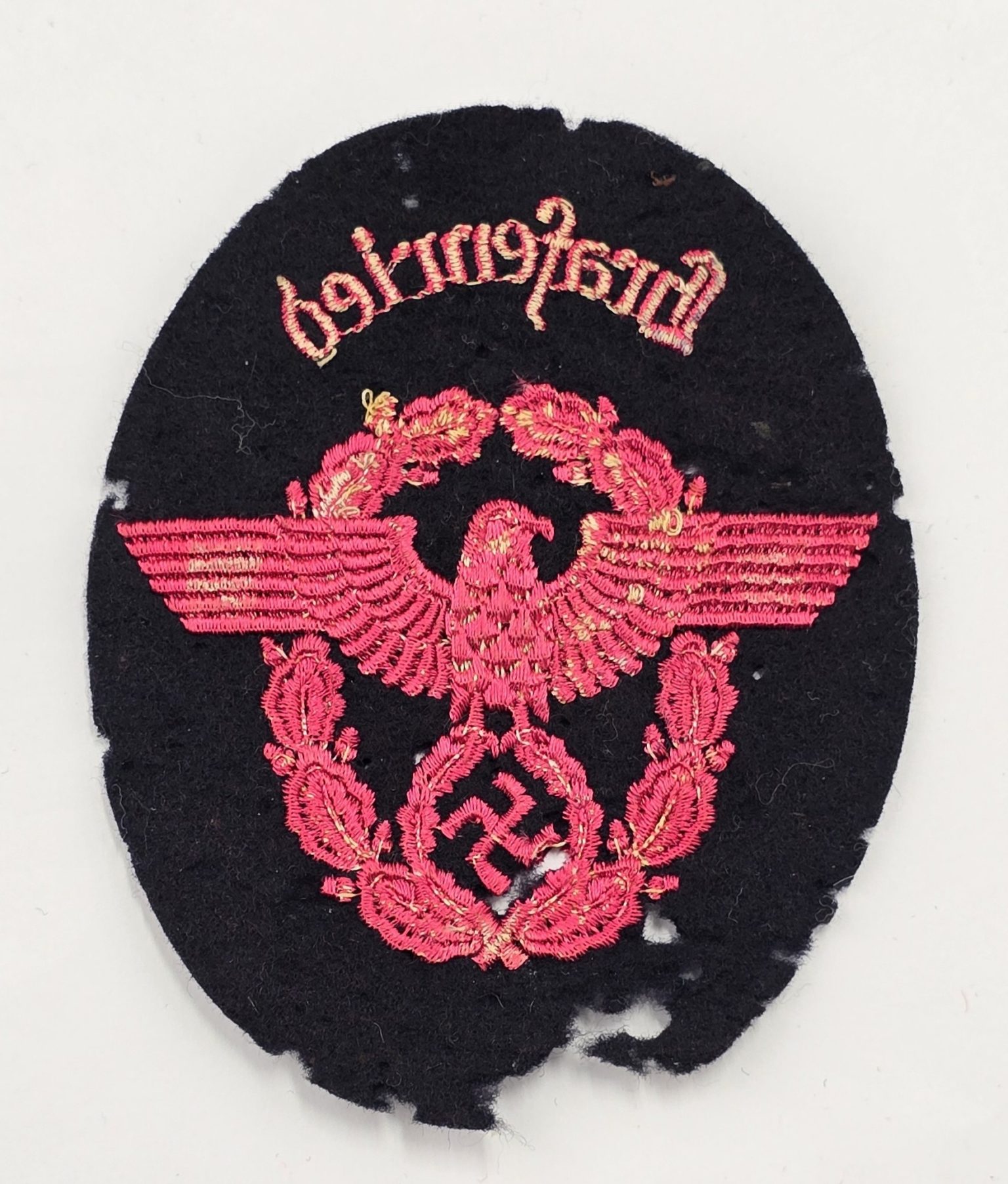 Pink stitched eagle and swastika with the town name above, removed from uniform with heavy moth.