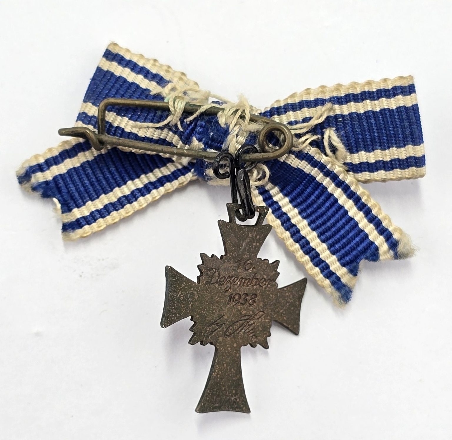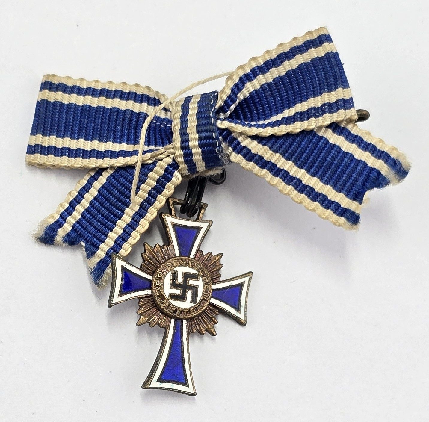 Miniature bronze enamel mothers cross on bow ribbon with pin to back in used condition.