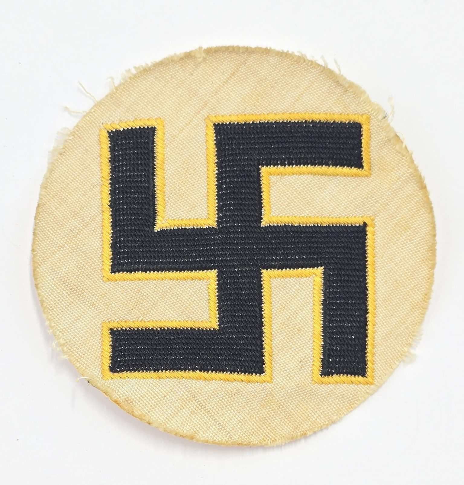 Large swastika with gilt edge surround on white with backing cloth in good used condition.