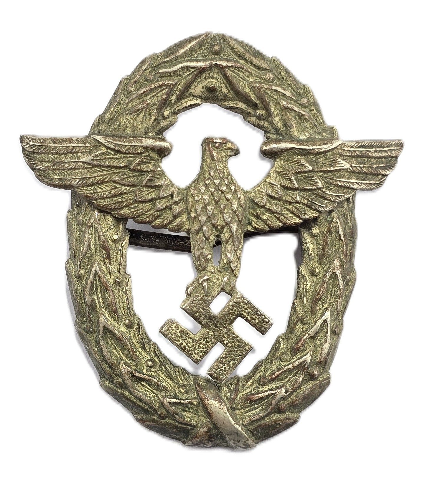 Early type police cap eagle, with remains of silver finish, two prongs to back, in good used condition.