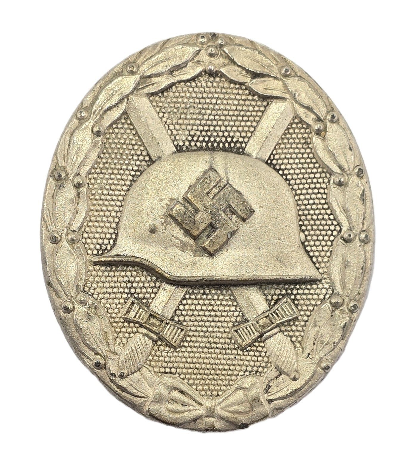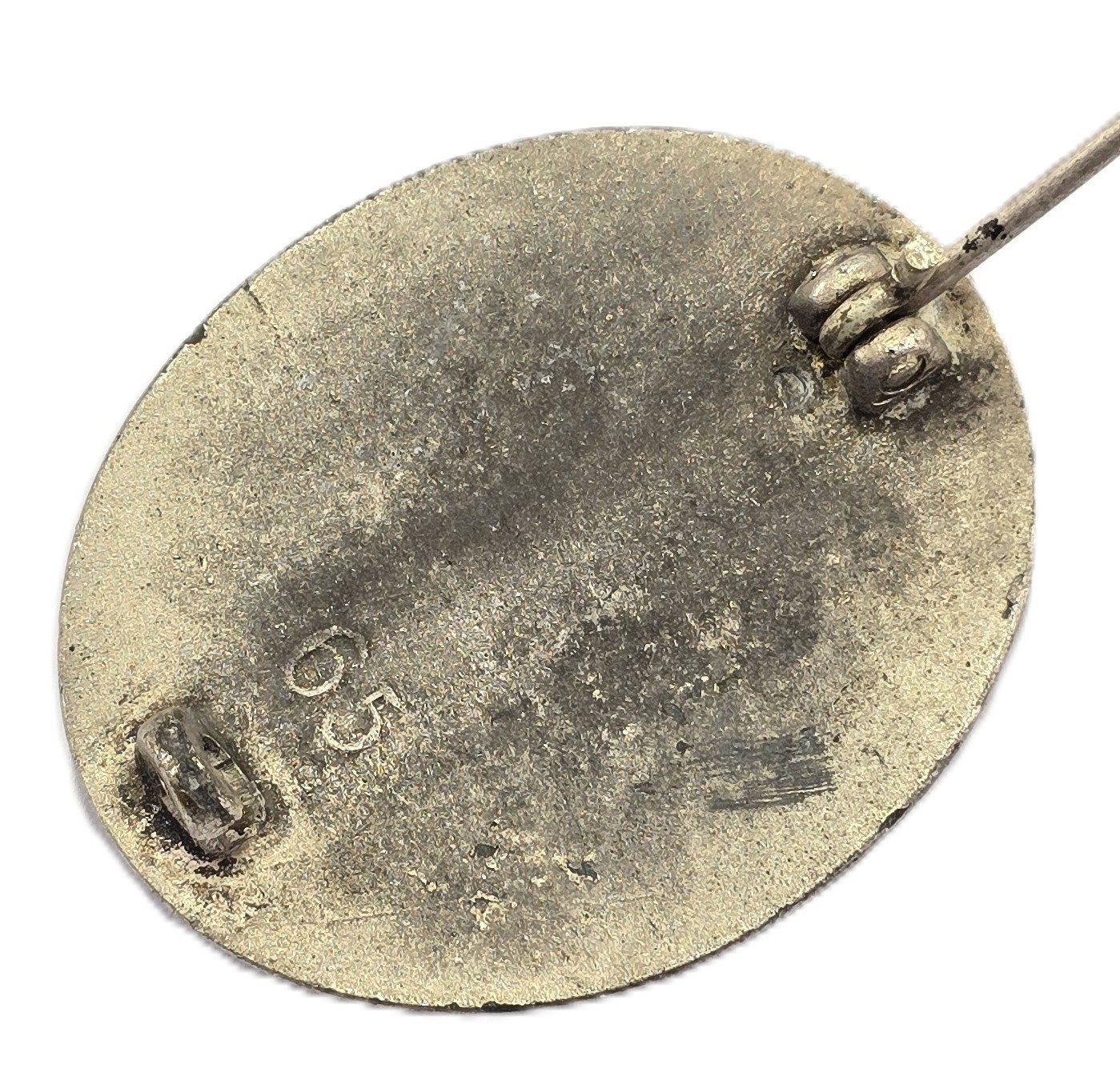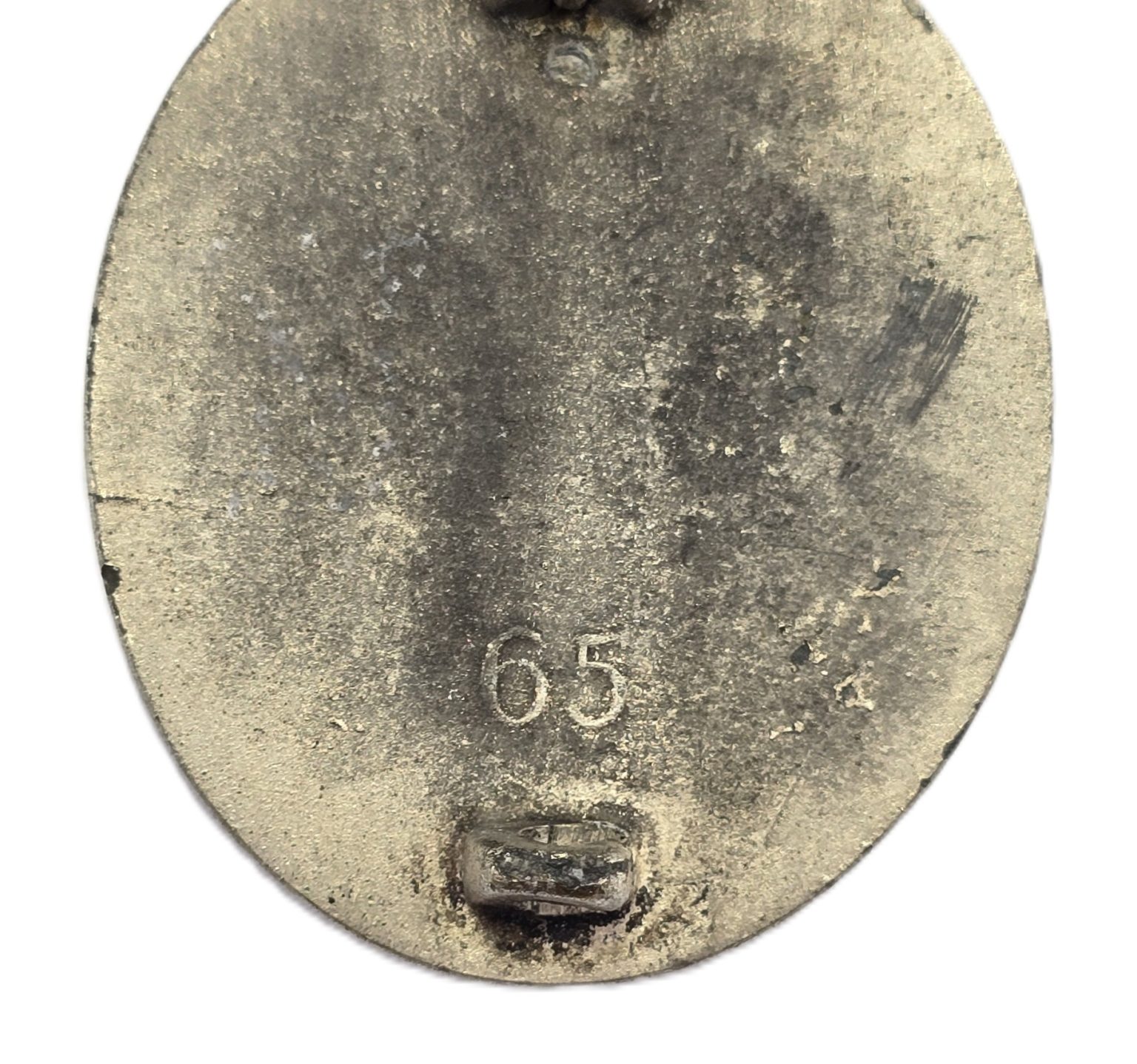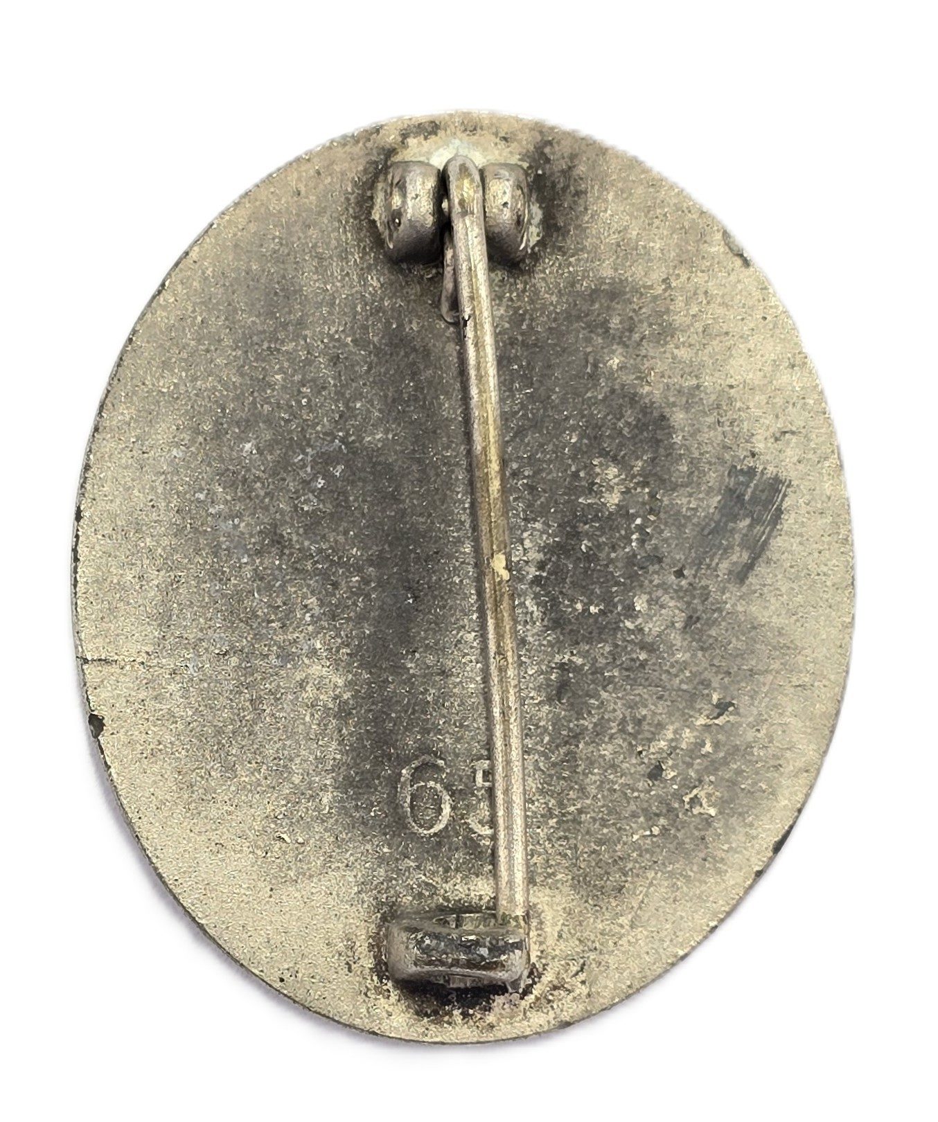Wound badge has most of the original silver finish, with pin and catch to back, maker marked 65, in good used condition.