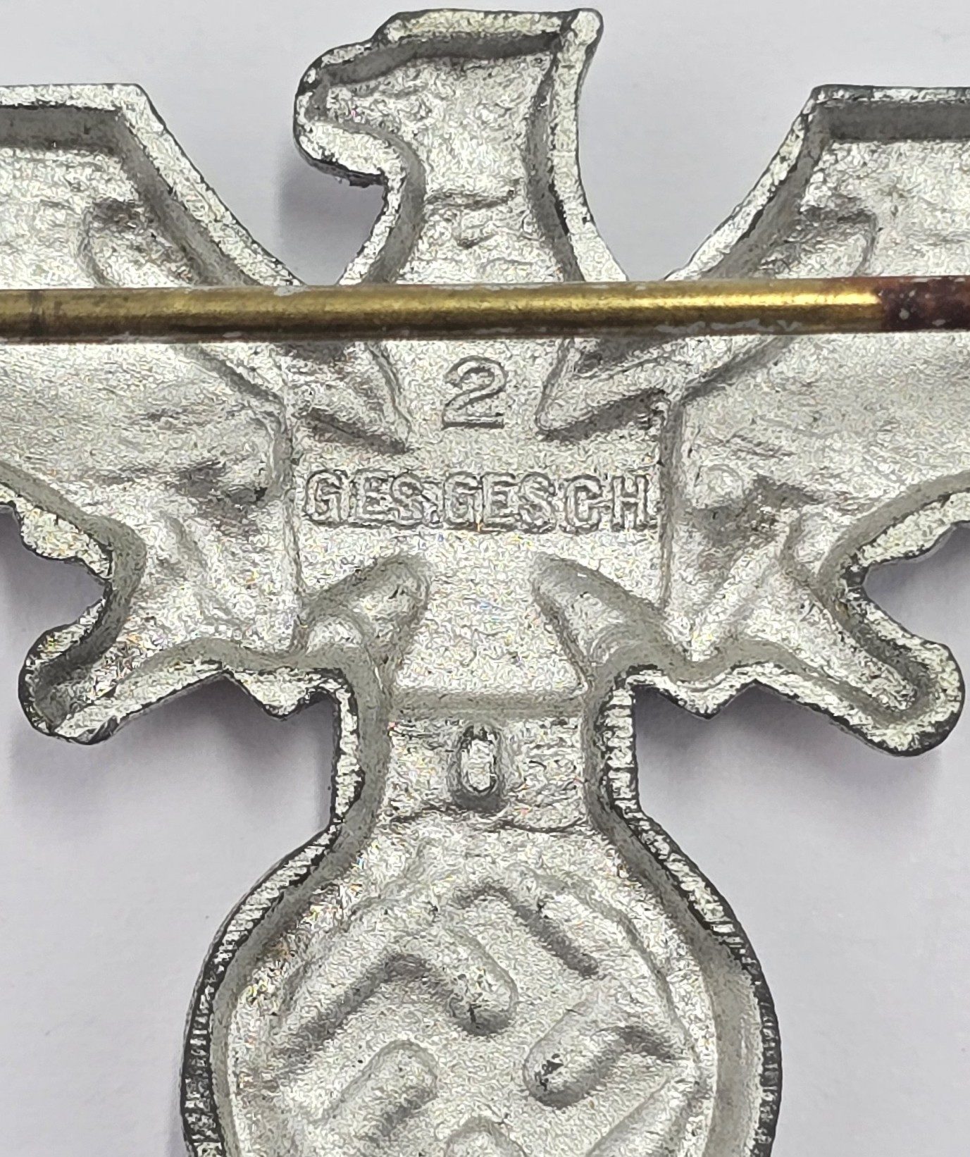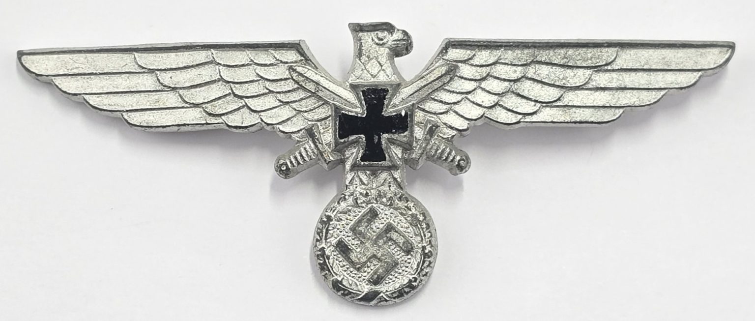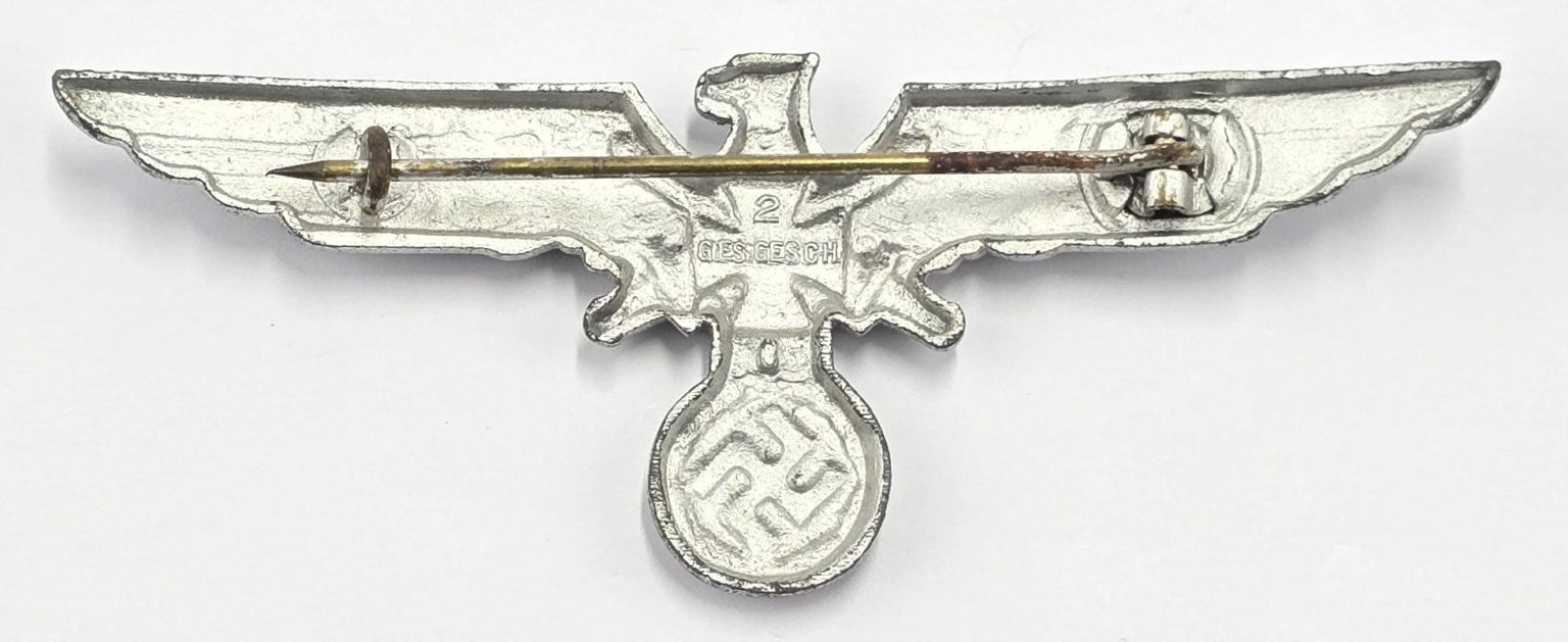 Large alloy breast eagle and swastika, with black enamel cross to center, maker, pin and catch back, in used condition.