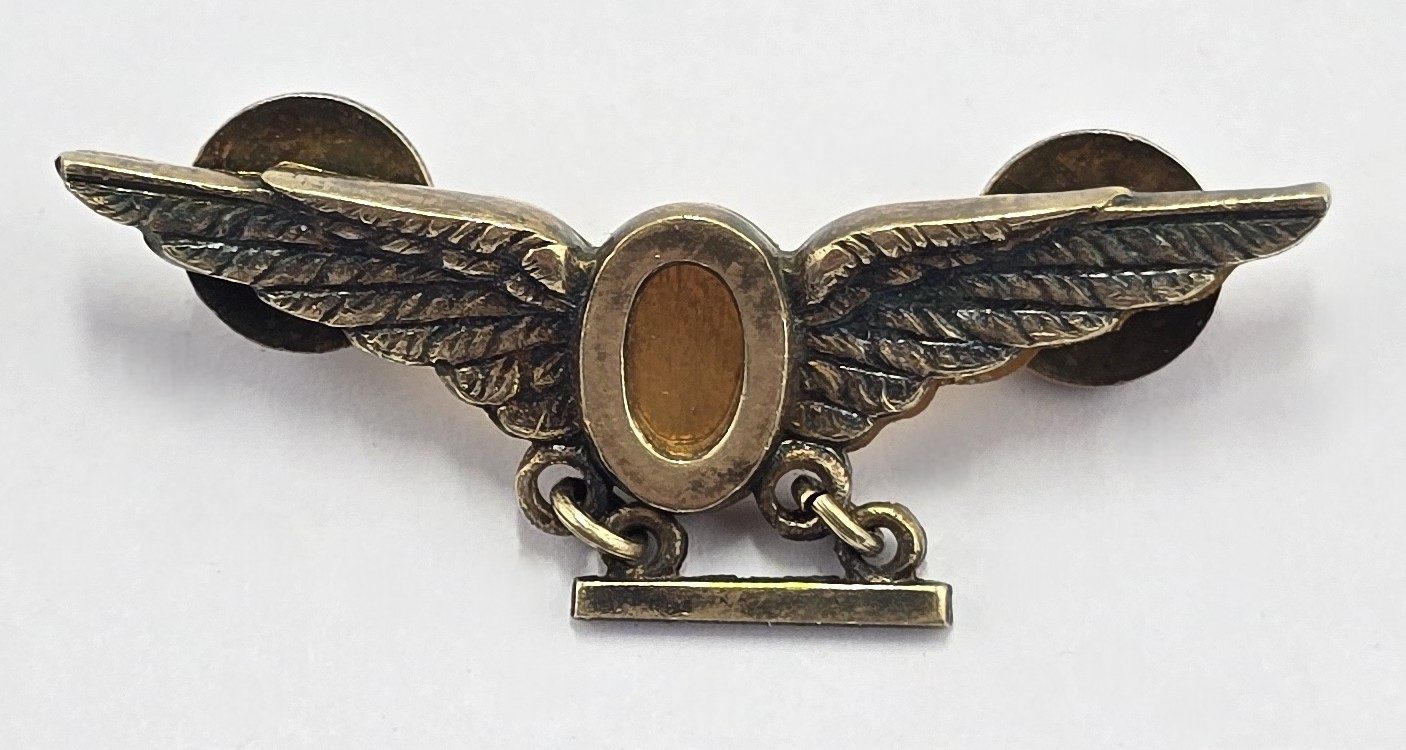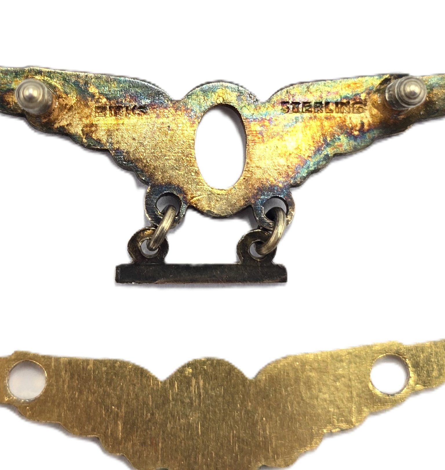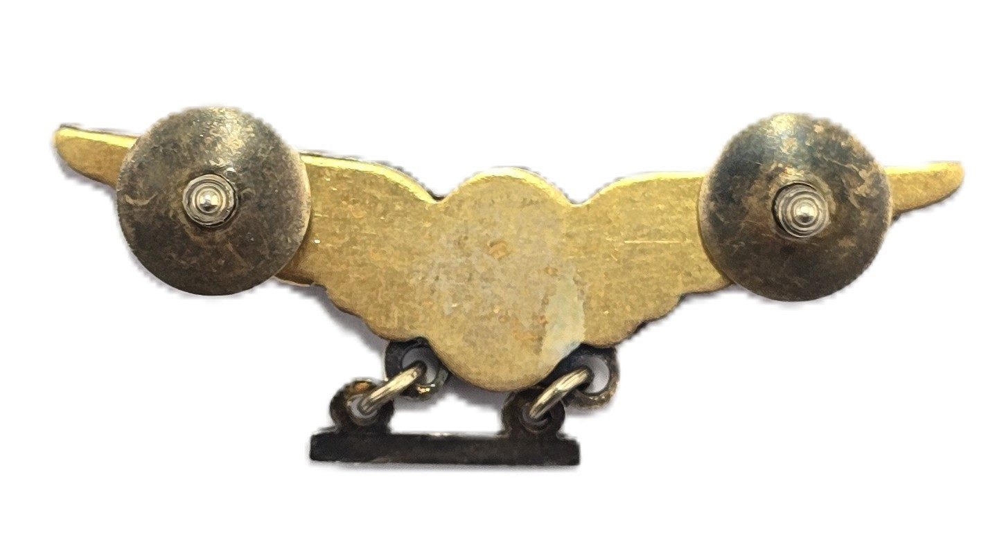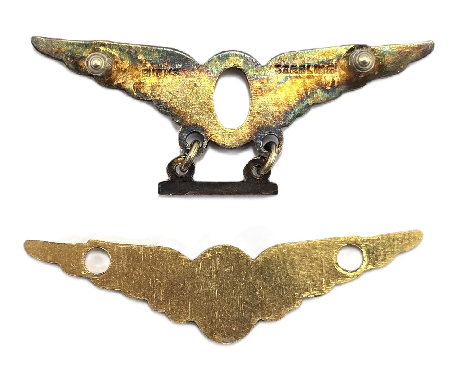 Super quality solid silver gilt wings with hanging second bar, maker and STERLING to back with screw,plate and disc fixings in good condition a rare badge to find.